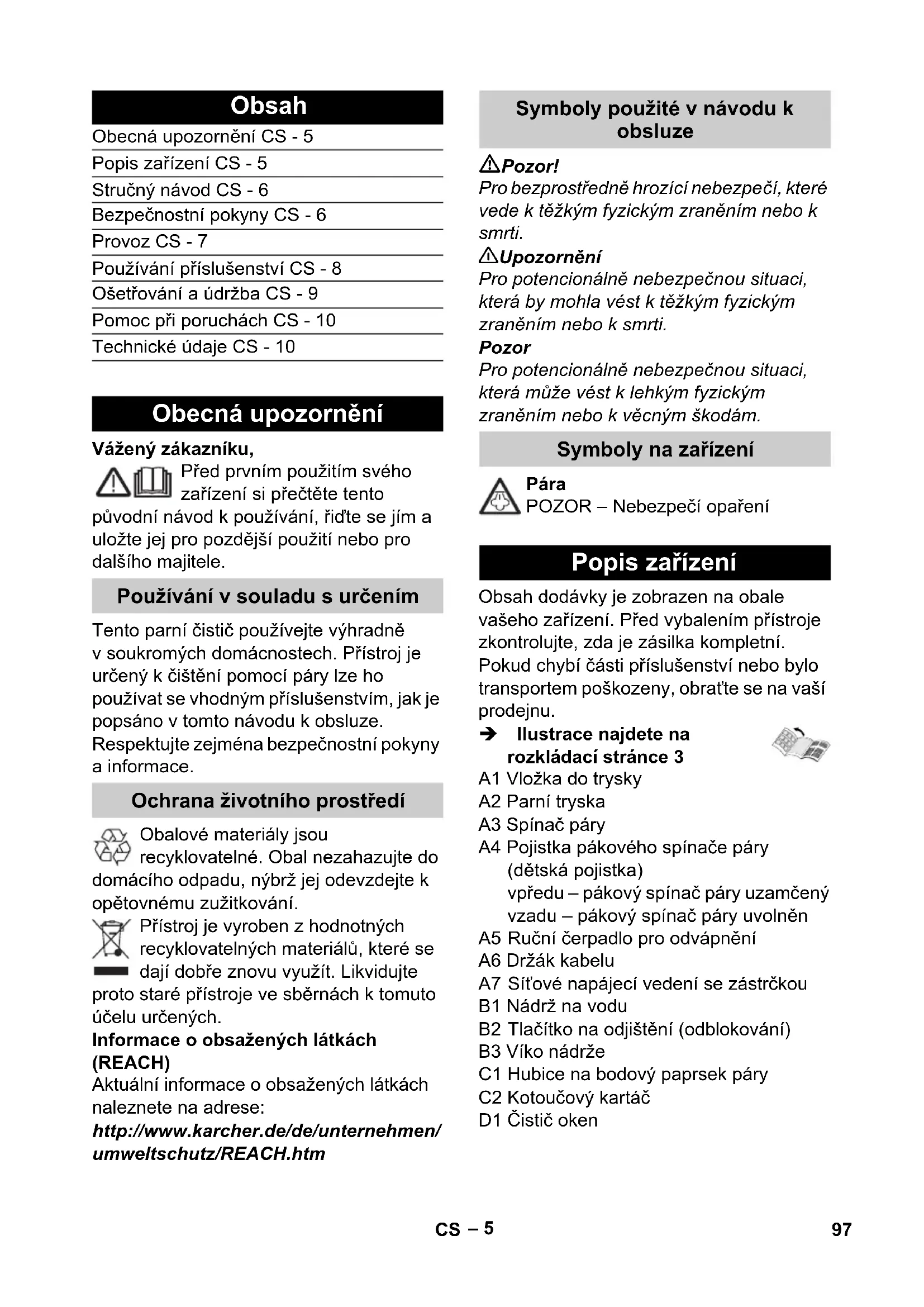 Védelmi osztály I Védelmi fokozat IPX4 Teljesítményre vonatkozó adatok Fűtőteljesítmény 1600 W Méretek Víztartály 0,25 l Tartozékok nélküli súly 1,2 kg szélesség 190 mm Hossz 100 mm magasság 280 mm Különleges tartozékok Megrendelési szám Körkefe készlet 2.863-058 4 körkefe a pontszórófejhez Körkefe készlet sárgaréz sörtékkel 2.863-061 erős szennyeződések eltávolításához. Nem érzékeny felületekhez ideális. Körkefe tisztító kaparóval 2.863-140 Körkefe kétsoros hőálló sörtékkel és tisztító kaparóval. Nem alkalmas érzékeny felületekhez. Vízkőtelenítő pálcikák 6.295-047 96 HU– 5 Vážený zákazníku, Před prvním použitím svého zařízení si přečtěte tento původní návod k používání, řiďte se jím a uložte jej pro pozdější použití nebo pro dalšího majitele. Tento parní čistič používejte výhradně v soukromých domácnostech. Přístroj je určený k čištění pomocí páry lze ho používat se vhodným příslušenstvím, jak je popsáno v tomto návodu k obsluze. Respektujte zejména bezpečnostní pokyny a informace. Obalové materiály jsou recyklovatelné. Obal nezahazujte do domácího odpadu, nýbrž jej odevzdejte k opětovnému zužitkování. Přístroj je vyroben z hodnotných recyklovatelných materiálů, které se dají dobře znovu využít. Likvidujte proto staré přístroje ve sběrnách k tomuto účelu určených. Informace o obsažených látkách (REACH) Aktuální informace o obsažených látkách naleznete na adrese: http://www.karcher.de/de/unternehmen/ umweltschutz/REACH.htm Pozor! Pro bezprostředně hrozící nebezpečí, které vede k těžkým fyzickým zraněním nebo k smrti. 몇 Upozornění Pro potencionálně nebezpečnou situaci, která by mohla vést k těžkým fyzickým zraněním nebo k smrti. Pozor Pro potencionálně nebezpečnou situaci, která může vést k lehkým fyzickým zraněním nebo k věcným škodám. Pára POZOR – Nebezpečí opaření Obsah dodávky je zobrazen na obale vašeho zařízení. Před vybalením přístroje zkontrolujte, zda je zásilka kompletní. Pokud chybí části příslušenství nebo bylo transportem poškozeny, obraťte se na vaší prodejnu. Î Ilustrace najdete na rozkládací stránce 3 Obsah Obecná upozornění CS - 5 Popis zařízení CS - 5 Stručný návod CS - 6 Bezpečnostní pokyny CS - 6 Provoz CS - 7 Používání příslušenství CS - 8 Ošetřování a údržba CS - 9 Pomoc při poruchách CS - 10 Technické údaje CS - 10 Obecná upozornění Používání v souladu s určením Ochrana životního prostředí Symboly použité v návodu k obsluze Symboly na zařízení Popis zařízení A1 Vložka do trysky A2 Parní tryska A3 Spínač páry A4 Pojistka pákového spínače páry (dětská pojistka) vpředu – pákový spínač páry uzamčený vzadu – pákový spínač páry uvolněn A5 Ruční čerpadlo pro odvápnění A6 Držák kabelu A7 Síťové napájecí vedení se zástrčkou B1 Nádrž na vodu B2 Tlačítko na odjištění (odblokování) B3 Víko nádrže C1 Hubice na bodový paprsek páry C2 Kotoučový kartáč D1 Čistič oken 97CS– 6 Î Ilustrace najdete na rozkládací stránce 4 1Vyjměte nádrž na vodu. 2Sejměte víko z nádrže. 3 Naplňte nádrž na vodu a uzavřete víkem nádrže. 4 Nádrž na vodu upevněte. 5Zasuňte sít'ovou zástrčku do zásuvky. Po cirka 15 vteřinách je možno s parním čističem pracovat. 6 Zablokování posuňte směrem dozadu a stiskněte spínač páry. Pozor! Nikdy nepracujte s vysokotlakým čističem v prostorách, ve kterých hrozí nebezpečí exploze! Používáte-li zařízení v nebezpečných prostorách, je třeba dodržovat příslušné bezpečnostní předpisy. Zařízení nepoužívejte v bazénech, ve kterých je voda. Zařízení se nesmí používat k čištění elektrických zařízení např. pečicích trub, digestoří, mikrovlnných pícek, televizorů , lamp, fénů, elektrického topení atd. Před použitím zařízení zkontrolujte zařízení a příslušenství, zda jsou v náležitém stavu. Pokud jejich stav není bez závad, nesmí se zařízení používat. Zkontrolujte prosím obzvláště síťový přívod, bezpečnostní uzávěr a parní hadici. Poškozený síťový přívod dejte neprodleně vyměnit autorizovaným zákaznickým servisem / kvalifikovaným elektrikářem. Poškozenou parní hadici neprodleně vyměňte. Je dovoleno používat pouze výrobcem doporučenou parní hadici (obj. č. viz seznam náhradních dílů). Nikdy se nedotýkejte síťového kabelu vlhkýma rukama. Nikdy neošetřujte parou předměty obsahující látky životu nebezpečné (např. azbest). Parního paprsku se nikdy nedotýkejte rukou na krátkou vzdálenost ani jím nemiřte na lidi nebo zvířata (nebezpečí opaření). 몇 Upozornění Přístroj smí být zapojen jen do takového el. přívodu, který byl instalován kvalifikovaným elektrikářem v souladu s mezinárodní normou IEC 60364 o elektrické instalaci budov. Přístroj zapojujte pouze na střídavý proud. Napětí musí být shodné s údaji o napětí na typovém štítku přístroje. Používáte-li přístroj ve vlhkých prostorách jako např. koupelně, zapojujte jej zásadně do zástrčky s předřazeným proudovým chráničem. Nevhodná prodlužovací vedení mohou být nebezpečná. Používejte pouze prodlužovací kabel chráněný proti postříkání o průměru nejméně 3x1 mm