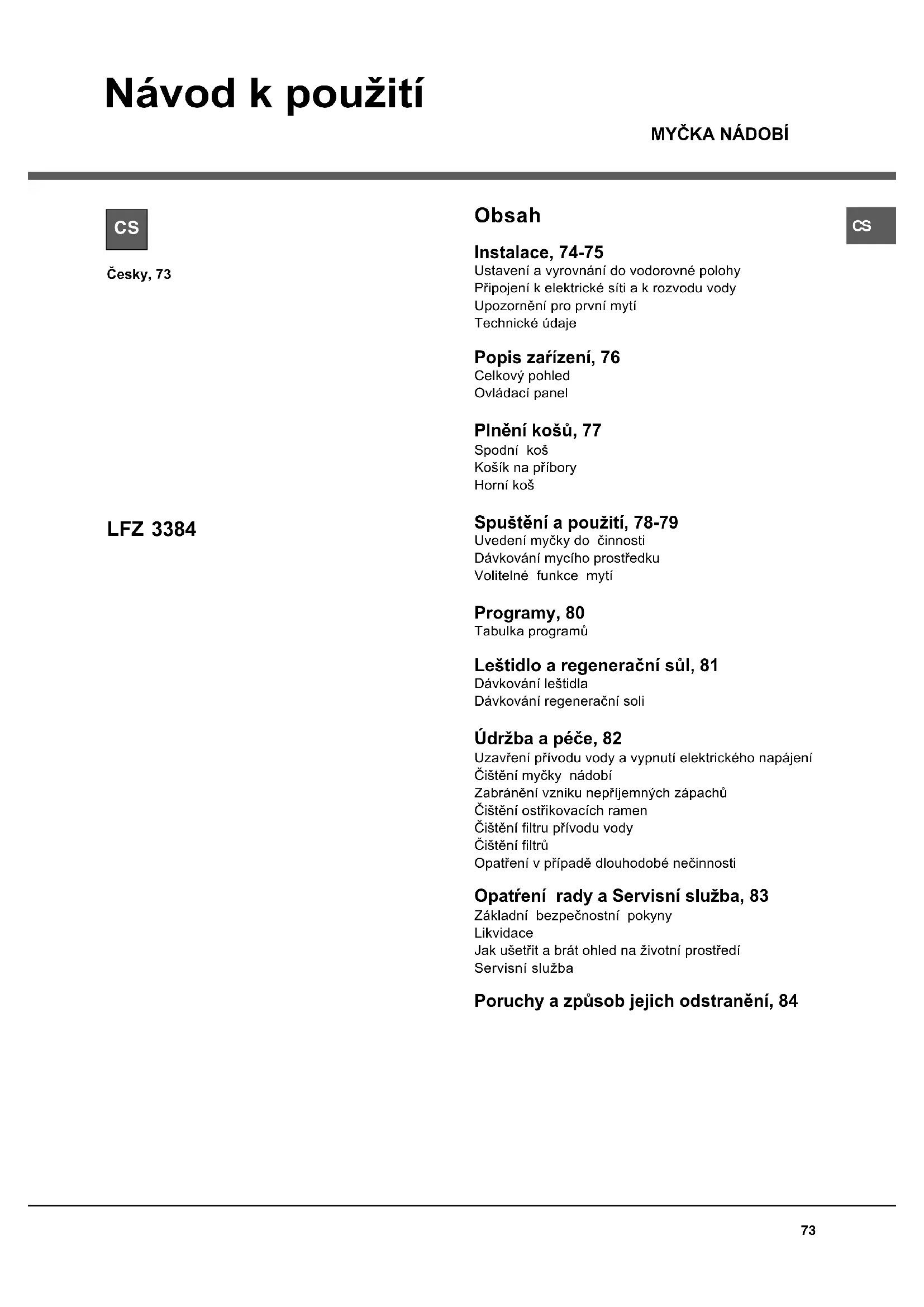 Návod k pouití Obsah Instalace, 74-75 Ustavení a vyrovnání do vodorovné polohy Pøipojení kelektrické síti a krozvodu vody Upozornìní pro první mytí Technické údaje Popis zaøízení, 76 Celkový pohled Ovládací panel Plnìní koù, 77 Spodní ko Koík na pøíbory Horní ko Sputìní a pouití, 78-79 Uvedení myèky do èinnosti Dávkování mycího prostøedku Volitelné funkce mytí Programy, 80 Tabulka programù Letidlo a regeneraèní sùl, 81 Dávkování letidla Dávkování regeneraèní soli Údrba a péèe, 82 Uzavøení pøívodu vody a vypnutí elektrického napájení Èitìní myèky nádobí Zabránìní vzniku nepøíjemných zápachù Èitìní ostøikovacích ramen Èitìní filtru pøívodu vody Èitìní filtrù Opatøení vpøípadì dlouhodobé neèinnosti Opatøení rady a Servisní sluba, 83 Základní bezpeènostní pokyny Likvidace Jak uetøit a brát ohled na ivotní prostøedí Servisní sluba Poruchy a zpùsob jejich odstranìní, 84