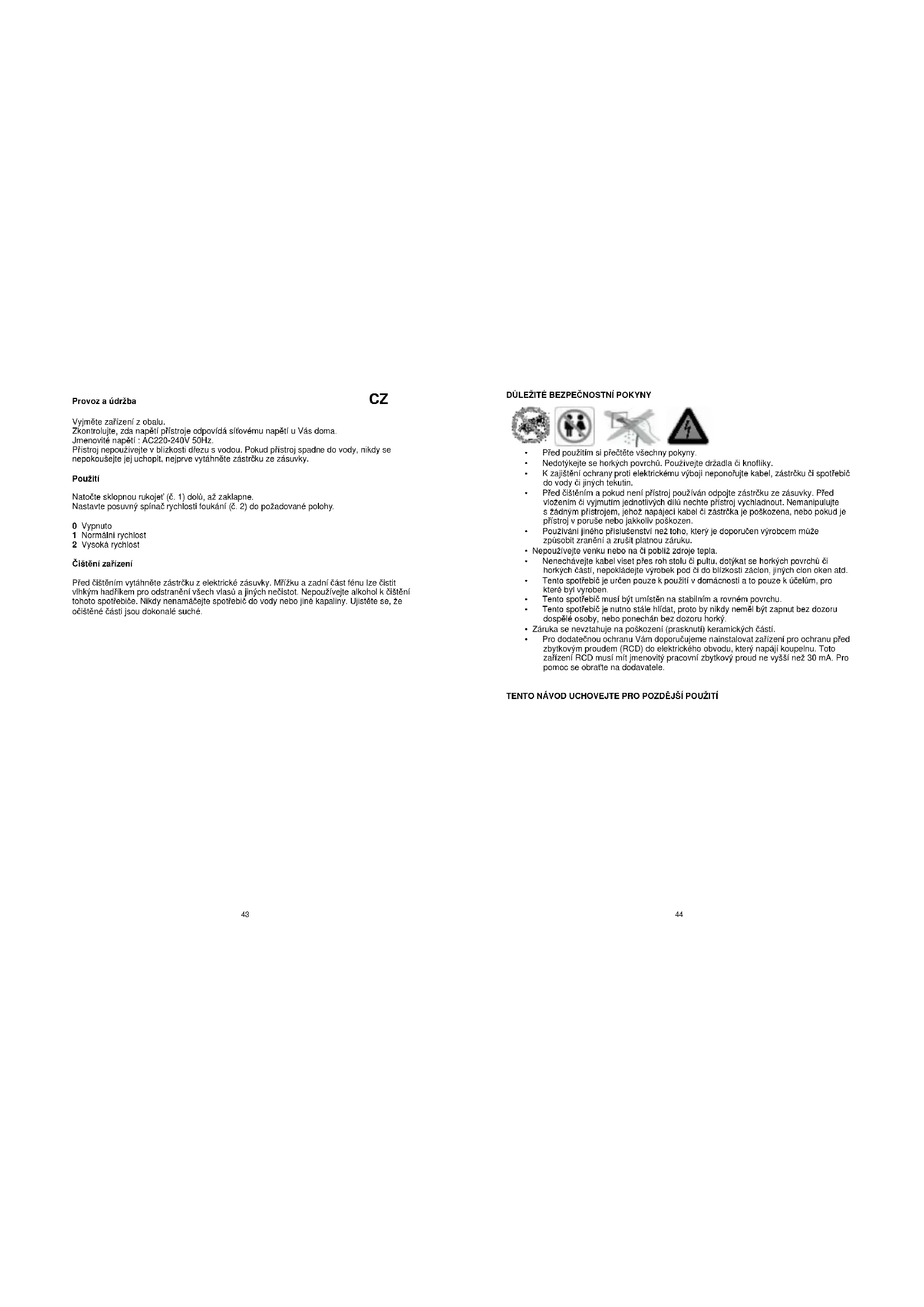 Vyjměte zařízení z obalu. Zkontrolujte, zda napětí přístroje odpovídá síťovému napětí u Vás doma. Jmenovité napětí : AC220-240V 50Hz. Přístroj nepoužívejte v blízkosti dřezu s vodou. Pokud přístroj spadne do vody, nikdy se nepokoušejte jej uchopit, nejprve vytáhněte zástrčku ze zásuvky. Použití Natočte sklopnou rukojeť (č. 1) dolů, až zaklapne. Nastavte posuvný spínač rychlosti foukání (č. 2) do požadované polohy. 0 Vypnuto 1 Normální rychlost 2 Vysoká rychlost Čištění zařízení Před čištěním vytáhněte zástrčku z elektrické zásuvky. Mřížku a zadní část fénu lze čistit vlhkým hadříkem pro odstranění všech vlasů a jiných nečistot. Nepoužívejte alkohol k čištění tohoto spotřebiče. Nikdy nenamáčejte spotřebič do vody nebo jiné kapaliny. Ujistěte se, že očištěné části jsou dokonalé suché.