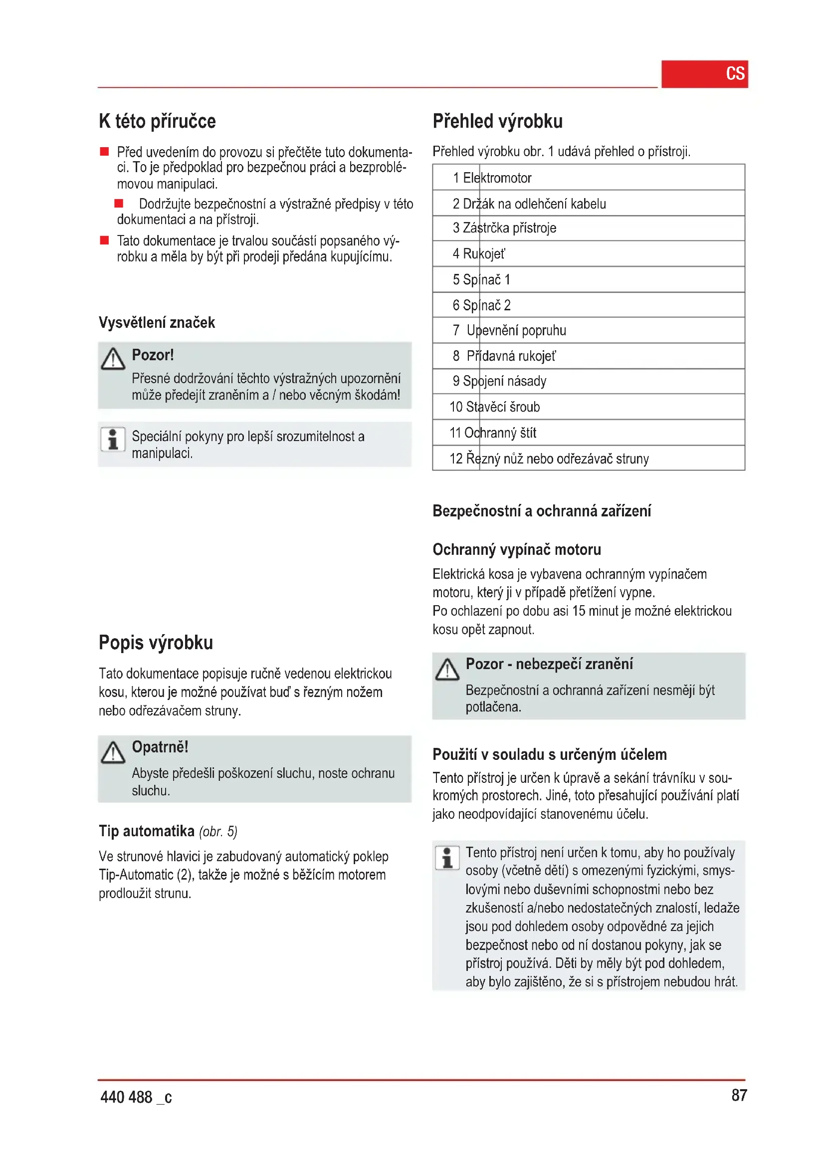 440 488 _c K této příručce Předuvedenímdoprovozusipřečtětetutodokumenta- ci.Tojepředpokladprobezpečnoupráciabezproblé- movou manipulaci. Dodržujtebezpečnostníavýstražnépředpisyvtéto dokumentacianapřístroji. Tatodokumentacejetrvalousoučástípopsanéhový- robkuamělabybýtpřiprodejipředánakupujícímu. Vysvětlení značek Pozor! Přesnédodržovánítěchtovýstražnýchupozornění můžepředejítzraněníma/nebověcnýmškodám! Speciální pokyny pro lepší srozumitelnost a manipulaci. Popis výrobku Tatodokumentacepopisujeručněvedenouelektrickou kosu,kteroujemožnépoužívatbuďsřeznýmnožem neboodřezávačemstruny. Opatrně! Abystepředešlipoškozenísluchu,nosteochranu sluchu. Tip automatika (obr. 5) Vestrunovéhlavicijezabudovanýautomatickýpoklep Tip-Automatic(2),takžejemožnésběžícímmotorem prodloužitstrunu. Přehled výrobku Přehledvýrobkuobr.1udávápřehledopřístroji. 1 Elektromotor 2 Držáknaodlehčeníkabelu 3 Zástrčkapřístroje 4 Rukojeť 5 Spínač1 6 Spínač2 7 Upevněnípopruhu 8 Přídavnárukojeť 9 Spojení násady 10 Stavěcíšroub 11 Ochrannýštít 12 Řeznýnůžneboodřezávačstruny Bezpečnostní a ochranná zařízení Ochranný vypínač motoru Elektrickákosajevybavenaochrannýmvypínačem motoru,kterýjivpřípaděpřetíženívypne. Poochlazenípodobuasi15minutjemožnéelektrickou kosuopětzapnout. Pozor - nebezpečí zranění Bezpečnostníaochrannázařízenínesmějíbýt potlačena. Použití v souladu s určeným účelem Tentopřístrojjeurčenkúpravěasekánítrávníkuvsou- kromýchprostorech.Jiné,totopřesahujícípoužíváníplatí jakoneodpovídajícístanovenémuúčelu. Tentopřístrojneníurčenktomu,abyhopoužívaly osoby(včetnědětí)somezenýmifyzickými,smys- lovýmineboduševnímischopnostminebobez zkušenostía/nebonedostatečnýchznalostí,ledaže jsoupoddohledemosobyodpovědnézajejich bezpečnostneboodnídostanoupokyny,jakse přístrojpoužívá.Dětibymělybýtpoddohledem, abybylozajištěno,žesispřístrojemnebudouhrát.88 Originální návod k použití Pozor! Přístrojnesmíbýtpoužívánkekomerčnímúčelům! Význam symbolů na přístroji Pozor! Přečtětesinávodkobsluze Nosteochrannébrýle,ochranusluchu Noste ochranné rukavice Nostebezpečnostníobuv Držtejinéosobystranou.Bezpečnostní vzdálenost min. 10 m Nebezpečíkvůliodletujícímpředmětům Pokudjeprodlužovacíkabelpoškozený neboprodřený,vytáhnětezástrčku okamžitězezásuvky Chraňtepřístrojpředdeštěmavlhkem Vzdálenostmezipřístrojematřetími osobamimusíbýtminimálně15m Bezpečnostní upozornění Pozor! Rotaceřeznýchnástrojůpovypnutímotoruještě pokračuje! Předpoužitímzkontrolujte,zdasíťováaprodlužovací vedení nevykazují známky poškození nebo stárnutí. Prodlužovacívedenídržtestranouřeznýchnástrojů. Je-livedeníběhempoužitípoškozeno,okamžitěho odpojteodsítě.