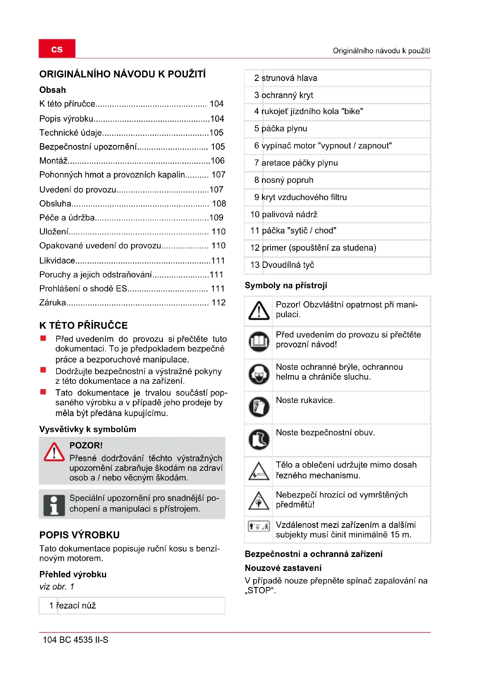 Tato dokumentace popisuje ruční kosu s benzí- novým motorem. Přehled výrobku viz obr. 1 1 řezací nůž 2 strunová hlava 3 ochranný kryt 4 rukojeť jízdního kola "bike" 5 páčka plynu 6 vypínač motor "vypnout / zapnout" 7 aretace páčky plynu 8 nosný popruh 9 kryt vzduchového filtru 10 palivová nádrž 11 páčka "sytič / chod" 12 primer (spouštění za studena) 13 Dvoudílná tyč Symboly na přístroji Pozor! Obzvláštní opatrnost při mani- pulaci. Před uvedením do provozu si přečtěte provozní návod! Noste ochranné brýle, ochrannou helmu a chrániče sluchu. Noste rukavice. Noste bezpečnostní obuv. Tělo a oblečení udržujte mimo dosah řezného mechanismu. Nebezpečí hrozící od vymrštěných předmětů! 15m(50ft) Vzdálenost mezi zařízením a dalšími subjekty musí činit minimálně 15 m. Bezpečnostní a ochranná zařízení Nouzové zastavení V případě nouze přepněte spínač zapalování na „STOP“.Popis výrobku 440 247_a 105 ochranný štít proti odletujícímu kamení Chrání uživatele před odmršťovanými předměty. Vestavěný nůž zkracuje řeznou strunu na přípust- nou délku. POZOR! Nebezpečí poranění! Bezpečnostní a ochranná zařízení nesmí být zrušena. Dvoudílná tyč Díky dvoudílné tyči lze po kosení motorovou kosu jednoduše rozebrat, složit a skladně uložit. Použití v souladu s určením Toto zařízení je určeno k vyžínání a sečení za- travněných pozemků pro osobní potřebu. Jiné použití překračující tento rámec platí za použití neodpovídající určení. Možné chybné použití POZOR! Přístroj je zakázáno provozovat v ře- meslné oblasti použití. TECHNICKÉ ÚDAJE BC 4535 II typ motoru 2-taktní, vzduchem chlazený zdvihový objem 42,7 cm³ výkon 1,1 kW hmotnost v suchém stavu 7,6 kg provozní hmotnost bez paliva 9,0 kg objem palivové nádrže 1,1 l zapalování elektronické zapalovací svíčka L8RTC pohon odstředivá spojka rukojeť rukojeť "bike" Hladina akustického výkonu 113 dB ± LpA 3 bdB hladina akustického tlaku 102 dB vibrace ≤ 15 m/s2 kolísavost K 2,25 m/s2 průměr struny 2,5 mm řezná šířka struny 41 cm řezná šířka řezného listu 25 cm počet otáček motoru max.