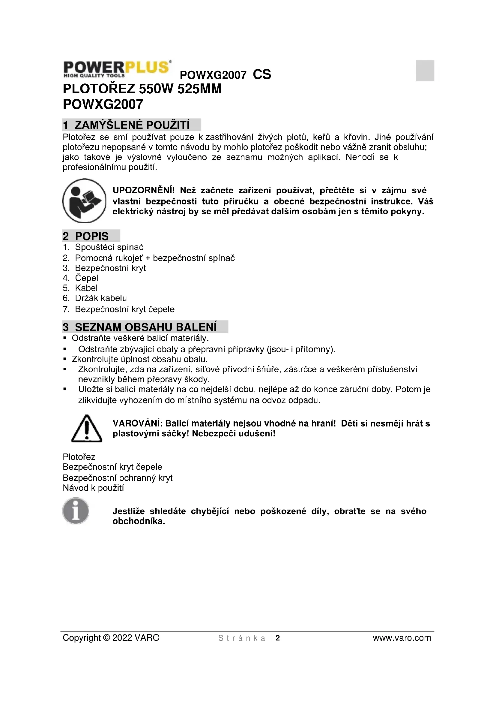 Použité zařízení nelikvidujte spolu s běžným domovním odpadem, ale řiďte se předpisy vydanými s ohledem na ochranu životního prostředí. Použité elektrické výrobky by neměly být zahrnuty do domácího odpadu. Odevzdejte je k recyklaci do adekvátních sběrných středisek. Další informace vám sdělí místní správa nebo prodejce.POWXG2007 CS Copyright © 2022 VARO S t r á n k a | 8 www.varo.com