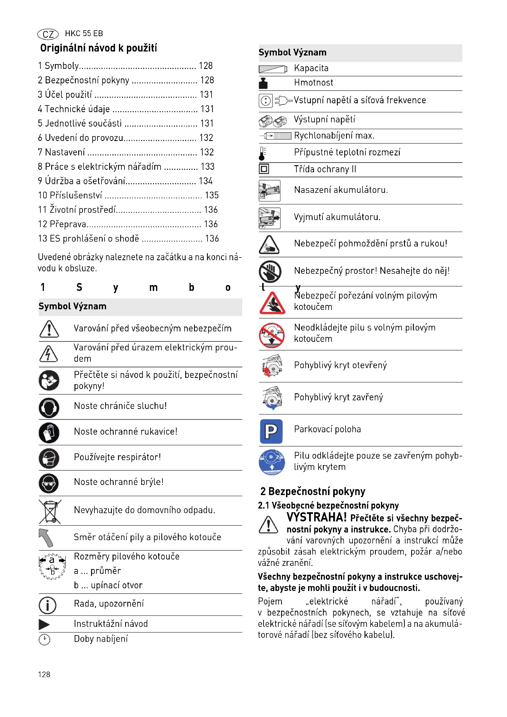 - VÝSTRAHA! Přečtěte si všechny bezpeč- nostní pokyny a instrukce. Chyba při dodržo- vání varovných upozornění a instrukcí může způsobit zásah elektrickým proudem, požár a/nebo vážné zranění. Všechny bezpečnostní pokyny a instrukce uschovej- te, abyste je mohli použít i v budoucnosti. Pojem „elektrické nářadí“, používaný v bezpečnostních pokynech, se vztahuje na síťové elektrické nářadí (se síťovým kabelem) a na akumulá- torové nářadí (bez síťového kabelu). 1 Symboly p. 128