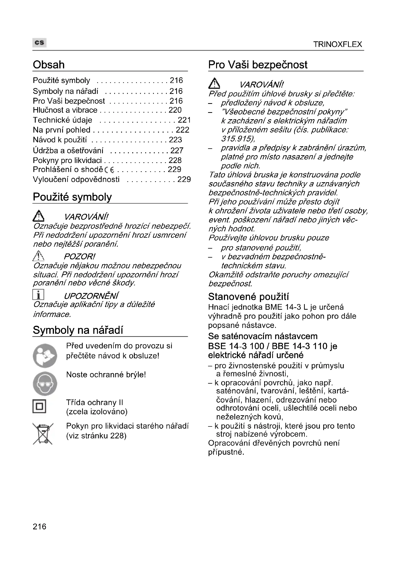 - Vyloučení odpovědnosti Použité symboly VAROVÁNÍ! Označuje bezprostředně hrozící nebezpečí. Při nedodržení upozornění hrozí usmrcení nebo nejtěžší poranění. POZOR! Označuje nějakou možnou nebezpečnou situaci. Při nedodržení upozornění hrozí poranění nebo věcné škody. UPOZORNĚNÍ Označuje aplikační tipy a důležité informace. Symboly na nářadí Před uvedením do provozu si přečtěte návod k obsluze! Noste ochranné brýle! Třída ochrany II (zcela izolováno) Pokyn pro likvidaci starého nářadí (viz stránku 228) Pro Vaši bezpečnost VAROVÁNÍ! Před použitím úhlové brusky si přečtěte: p. 229