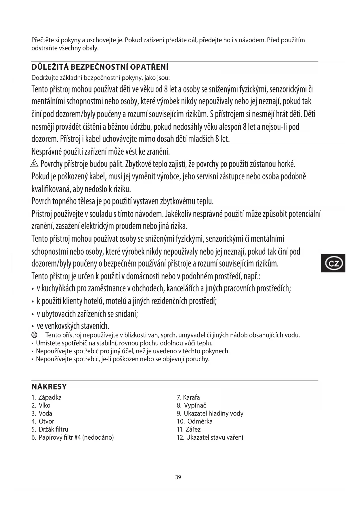Во избежание воздействия вредных веществ на окружающую среду и здоровье приборы и батареи одноразового или многоразового использования, помеченные одним из этих символов, необходимо утилизировать отдельно от несортированных бытовых отходов. Обязательно утилизируйте электрические и электронные изделия, а также (если это применимо) батареи одноразового или многоразового использования в соответствующих официальных пунктах повторной переработки / сбора отходов.39 Přečtěte si pokyny a uschovejte je. Pokud zařízení předáte dál, předejte ho i s návodem. Před použitím odstraňte všechny obaly. DŮLEŽITÁ BEZPEČNOSTNÍ OPATŘENÍ Dodržujte základní bezpečnostní pokyny, jako jsou: Tento přístroj mohou používat děti ve věku od 8 let a osoby se sníženými fyzickými, senzorickými či mentálními schopnostmi nebo osoby, které výrobek nikdy nepoužívaly nebo jej neznají, pokud tak činí pod dozorem/byly poučeny a rozumí souvisejícím rizikům. S přístrojem si nesmějí hrát děti. Děti nesmějí provádět čištění a běžnou údržbu, pokud nedosáhly věku alespoň 8 let a nejsou-li pod dozorem. Přístroj i kabel uchovávejte mimo dosah dětí mladších 8 let. Nesprávné použití zařízení může vést ke zranění. h Povrchy přístroje budou pálit. Zbytkové teplo zajistí, že povrchy po použití zůstanou horké. Pokud je poškozený kabel, musí jej vyměnit výrobce, jeho servisní zástupce nebo osoba podobně kvalifikovaná, aby nedošlo k riziku. Povrch topného tělesa je po použití vystaven zbytkovému teplu. Přístroj používejte v souladu s tímto návodem. Jakékoliv nesprávné použití může způsobit potenciální zranění, zasažení elektrickým proudem nebo jiná rizika. Tento přístroj mohou používat osoby se sníženými fyzickými, senzorickými či mentálními schopnostmi nebo osoby, které výrobek nikdy nepoužívaly nebo jej neznají, pokud tak činí pod dozorem/byly poučeny o bezpečném používání přístroje a rozumí souvisejícím rizikům. Tento přístroj je určen k použití v domácnosti nebo v podobném prostředí, např.: