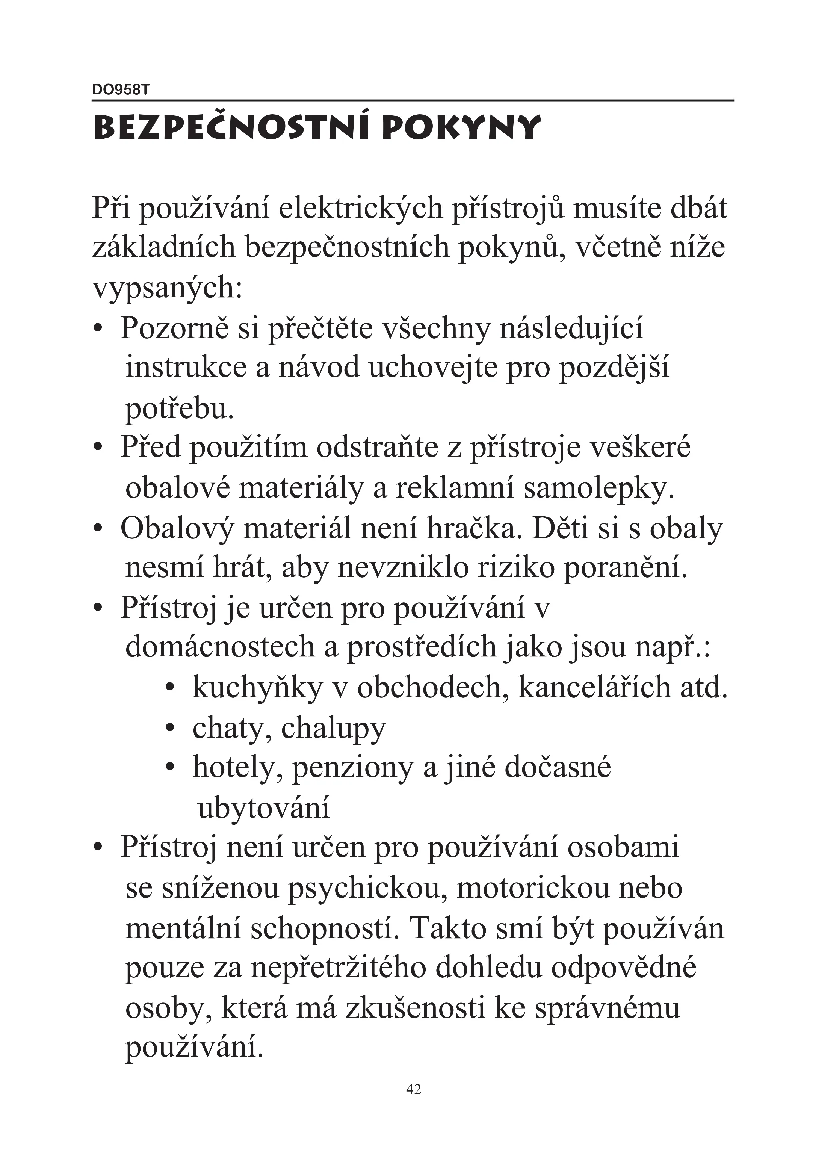 - Přístroj není určen pro používání osobami se sníženou psychickou, motorickou nebo mentální schopností. Takto smí být používán pouze za nepřetržitého dohledu odpovědné osoby, která má zkušenosti ke správnému používání.DO958T
