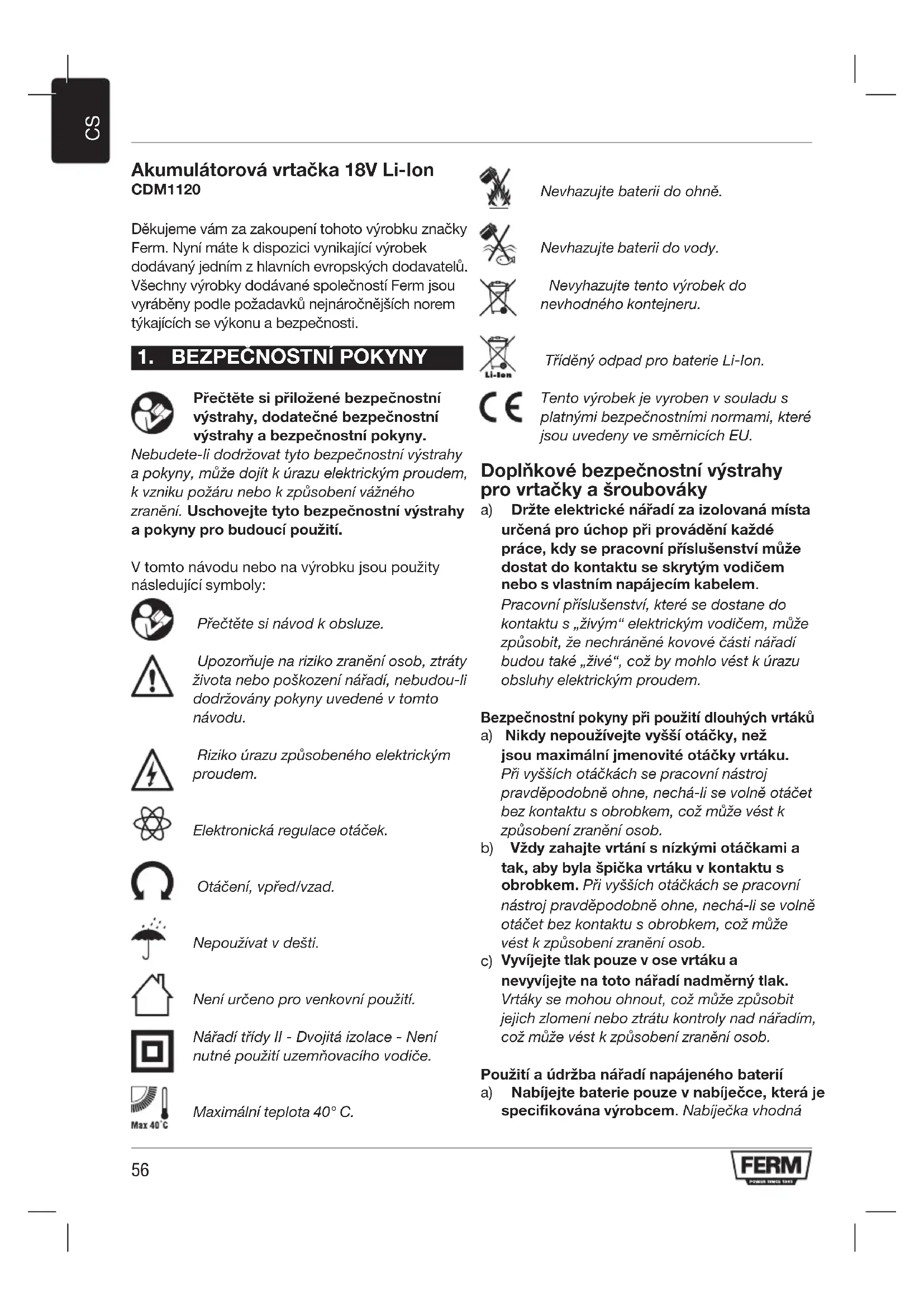 Akumulátorová vrtačka 18V Li-Ion CDM1120 Děkujemevámzazakoupenítohotovýrobkuznačky Ferm.Nynímátekdispozicivynikajícívýrobek dodávanýjednímzhlavníchevropskýchdodavatelů. VšechnyvýrobkydodávanéspolečnostíFermjsou vyráběnypodlepožadavkůnejnáročnějšíchnorem týkajícíchsevýkonuabezpečnosti.