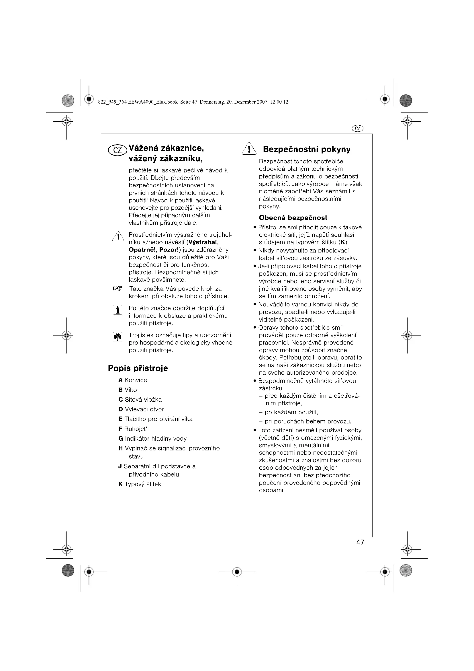 Vážená zákaznice, vážený zákazníku, pøeètìte si laskavì peèlivì návod k použití. Dbejte pøedevším bezpeènostních ustanovení na prvních stránkách tohoto návodu k použití! Návod k použití laskavì uschovejte pro pozdìjší vyhledání. Pøedejte jej pøípadným dalším vlastníkùm pøístroje dále. Prostøednictvím výstražného trojúhel-níku a/nebo návìstí (Výstraha!, Opatrnì!, Pozor!) jsou zdùraznìny pokyny, které jsou dùležité pro Vaši bezpeènost èi pro funkènost pøístroje. Bezpodmíneènì si jich laskavì povšimnìte.0 Tato znaèka Vás povede krok za krokem pøi obsluze tohoto pøístroje. Po této znaèce obdržíte doplòující informace k obsluze a praktickému použití pøístroje. Trojlístek oznaèuje tipy a upozornìní pro hospodárné a ekologicky vhodné použití pøístroje. Popis pøístroje A KonviceB VíkoC Sítová vložkaD Vylévací otvorE Tlaèítko pro otvírání víkaF Rukojet’G Indikátor hladiny vodyH Vypínaè se signalizací provozního stavuJ Separátní díl podstavce a pøívodního kabeluK Typový štítek 1 Bezpeènostní pokyny Bezpeènost tohoto spotøebièe odpovídá platným technickým pøedpisùm a zákonu o bezpeènosti spotøebièù. Jako výrobce máme však nicménì zapotøebí Vás seznámit s následujícími bezpeènostními pokyny.Obecná bezpeènost• Pøístroj se smí pøipojit pouze k takové elektrické síti, jejíž napìtí souhlasí s údajem na typovém štítku (K)!• Nikdy nevytahujte za pøipojovací kabel sít’ovou zástrèku ze zásuvky.• Je-li pøipojovací kabel tohoto pøístroje poškozen, musí se prostøednictvím výrobce nebo jeho servisní služby èi jiné kvalifikované osoby vymìnit, aby se tím zamezilo ohrožení.• Neuvádìjte varnou konvici nikdy do provozu, spadla-li nebo vykazuje-li viditelné poškození.• Opravy tohoto spotøebièe smí provádìt pouze odbornì vyškolení pracovníci. Nesprávnì provedené opravy mohou zpùsobit znaèné škody. Potøebujete-li opravu, obrat’te se na naši zákaznickou službu nebo na svého autorizovaného prodejce.• Bezpodmíneènì vytáhnìte sít’ovou zástrèku– pøed každým èistìním a ošetøová-ním pøístroje,– po každém použití,– pri poruchách behem provozu.• Toto zaøízení nesmìjí používat osoby (vèetnì dìtí) s omezenými fyzickými, smyslovými a mentálními schopnostmi nebo nedostateènými zkušenostmi a znalostmi bez dozoru osob odpovìdných za jejich bezpeènost ani bez pøedchozího pouèení provedeného odpovìdnými osobami.822_949_364 EEWA4000_Elux.book Seite 47 Donnerstag, 20. Dezember 2007 12:00 12c