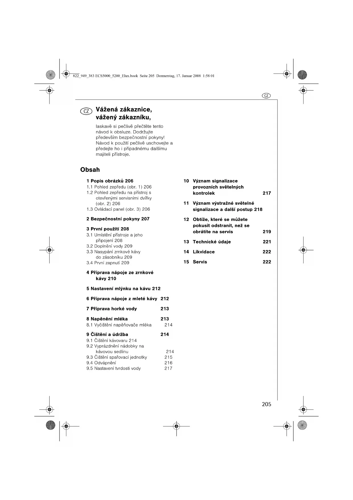 9 Èištìní a údržba 214 9.1 Èištìní kávovaru 2149.2 Vyprázdnìní nádobky na kávovou sedlinu 2149.3 Èištìní spaøovací jednotky 2159.4 Odvápnìní 2169.5 Nastavení tvrdosti vody 217 10 Význam signalizace provozních svìtelných kontrolek 217 11 Význam výstražné svìtelné signalizace a další postup 218 12 Obtíže, které se mùžete pokusit odstranit, než se obrátíte na servis 219 13 Technické údaje 221 14 Likvidace 222 15 Servis 222 822_949_383 ECS5000_5200_Elux.book Seite 205 Donnerstag, 17. Januar 2008 1:58 01c