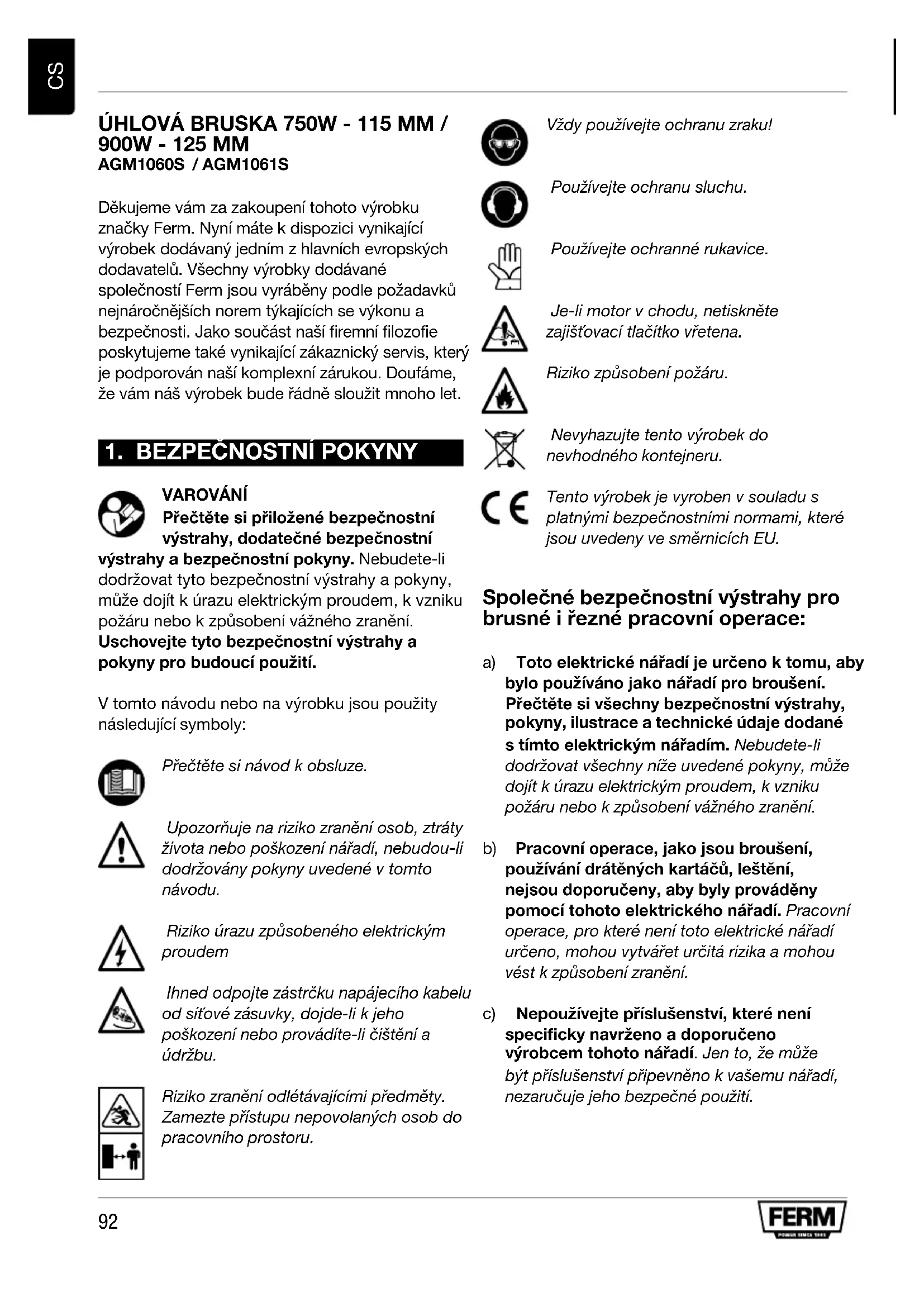 Děkujeme vám za zakoupení tohoto výrobku značky Ferm. Nyní máte k dispozici vynikající výrobek dodávaný jedním z hlavních evropských dodavatelů. Všechny výrobky dodávané společností Ferm jsou vyráběny podle požadavků nejnáročnějších norem týkajících se výkonu a bezpečnosti. Jako součást naší firemní filozofie poskytujeme také vynikající zákaznický servis, který je podporován naší komplexní zárukou. Doufáme, že vám náš výrobek bude řádně sloužit mnoho let.