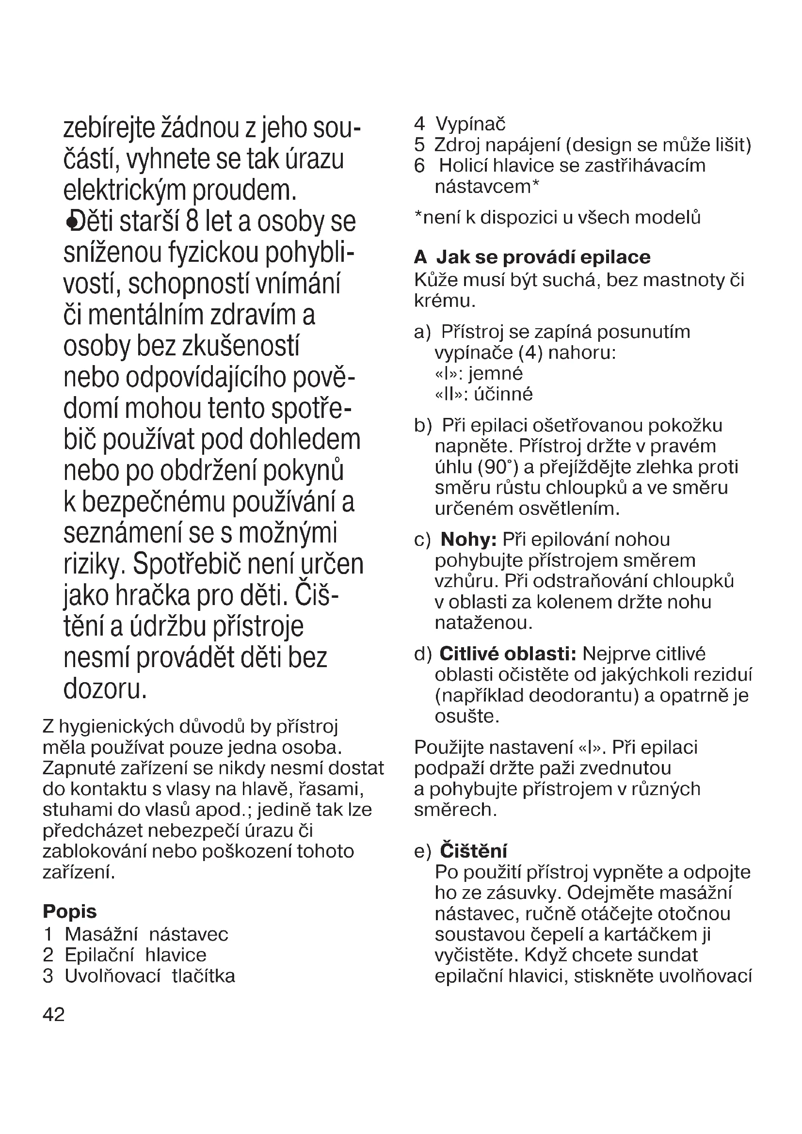a) mechaniczne uszkodzenia sprzętu spowodowane w czasie jego użytkowania lub w czasie dostarczania sprzętu do naprawy; b) uszkodzenia i wady wynikłe na skutek: 90323726_SE_3_Grocery.indd 4190323726_SE_3_Grocery.indd 41 02.06.22 15:3502.06.22 15:3542 4 Vypínač 5 Zdroj napájení (design se může lišit) 6 Holicí hlavice se zastřihávacím nástavcem* *není k dispozici u všech modelů A Jak se provádí epilace Kůže musí být suchá, bez mastnoty či krému. a) Přístroj se zapíná posunutím vypínače (4) nahoru: «I»: jemné «II»: účinné b) Při epilaci ošetřovanou pokožku napněte. Přístroj držte v pravém úhlu (90°) a přejíždějte zlehka proti směru růstu chloupků a ve směru určeném osvětlením. c) Nohy: Při epilování nohou pohybujte přístrojem směrem vzhůru. Při odstraňování chloupků v oblasti za kolenem držte nohu nataženou. d) Citlivé oblasti: Nejprve citlivé oblasti očistěte od jakýchkoli reziduí (například deodorantu) a opatrně je osušte. Použijte nastavení «I». Při epilaci podpaží držte paži zvednutou a pohybujte přístrojem v různých směrech. e) Čištění Po použití přístroj vypněte a odpojte ho ze zásuvky. Odejměte masážní nástavec, ručně otáčejte otočnou soustavou čepelí a kartáčkem ji vyčistěte. Když chcete sundat epilační hlavici, stiskněte uvolňovací zebírejte žádnou z jeho sou- částí, vyhnete se tak úrazu elektrickým proudem.