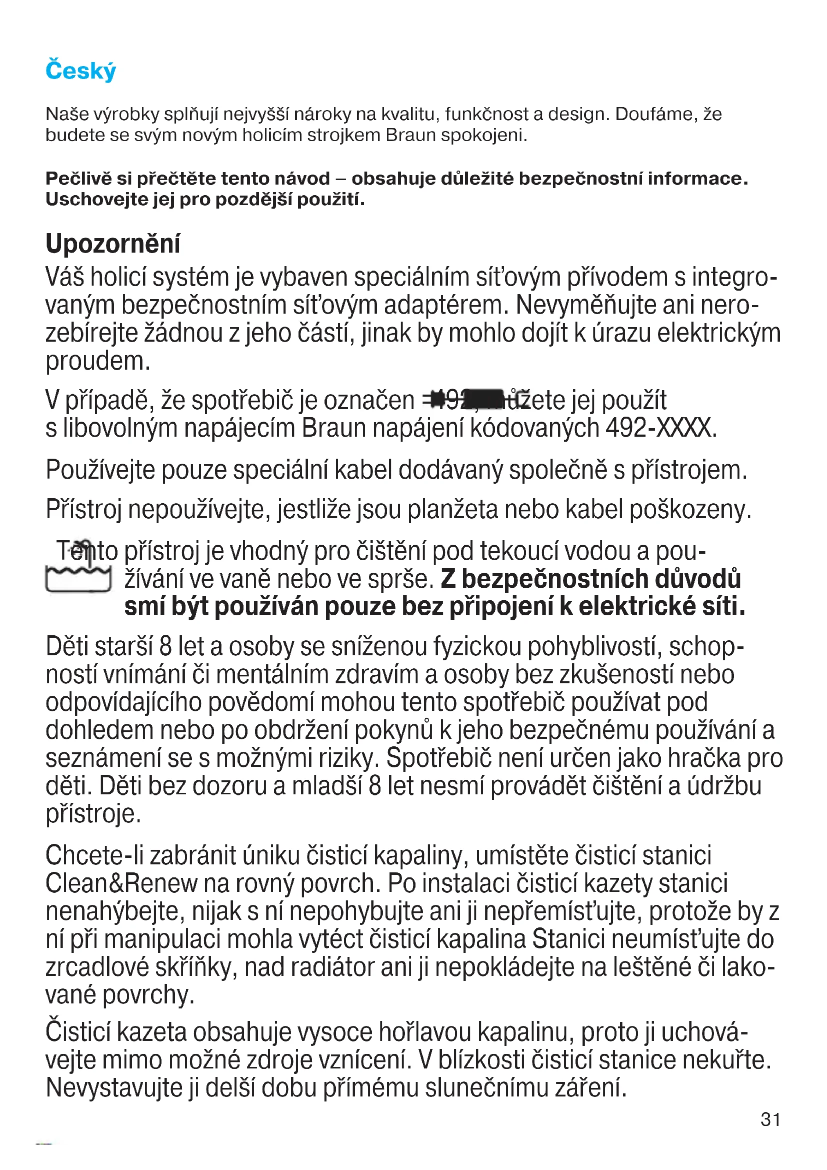 ani nie zawiesza uprawnień Kupującego wynikających z przepisów o rękojmi za wady rzeczy sprzedanej. 91445704_7880cc_7867cc_7865CC_7850cc_CEMEA_S6-132.indd 3091445704_7880cc_7867cc_7865CC_7850cc_CEMEA_S6-132.indd 30 18.04.17 15:2018.04.17 15:20 CSS APPROVED Effective Date 11May2017 GMT - Printed 31Aug2017 Page 30 of 13231 Česk Naše výrobky splňují nejvyšší nároky na kvalitu, funkčnost a design. Doufáme, že budete se svým novým holicím strojkem Braun spokojeni. Pečlivě si přečtěte tento návod – obsahuje důležité bezpečnostní informace. Uschovejte jej pro pozdější použití. Upozornění Váš holicí systém je vybaven speciálním síťovým přívodem s integro- vaným bezpečnostním síťovým adaptérem. Nevyměňujte ani nero- zebírejte žádnou z jeho částí, jinak by mohlo dojít k úrazu elektrickým proudem. V případě, že spotřebič je označen 492, můžete jej použít s libovolným napájecím Braun napájení kódovaných 492-XXXX. Používejte pouze speciální kabel dodávaný společně s přístrojem. Přístroj nepoužívejte, jestliže jsou planžeta nebo kabel poškozeny. Tento přístroj je vhodný pro čištění pod tekoucí vodou a pou- žívání ve vaně nebo ve sprše. Z bezpečnostních důvodů smí být používán pouze bez připojení k elektrické síti. Děti starší 8 let a osoby se sníženou fyzickou pohyblivostí, schop- ností vnímání či mentálním zdravím a osoby bez zkušeností nebo odpovídajícího povědomí mohou tento spotřebič používat pod dohledem nebo po obdržení pokynů k jeho bezpečnému používání a seznámení se s možnými riziky. Spotřebič není určen jako hračka pro děti. Děti bez dozoru a mladší 8 let nesmí provádět čištění a údržbu přístroje. Chcete-li zabránit úniku čisticí kapaliny, umístěte čisticí stanici Clean&Renew na rovný povrch. Po instalaci čisticí kazety stanici nenahýbejte, nijak s ní nepohybujte ani ji nepřemísťujte, protože by z ní při manipulaci mohla vytéct čisticí kapalina Stanici neumísťujte do zrcadlové skříňky, nad radiátor ani ji nepokládejte na leštěné či lako- vané povrchy. Čisticí kazeta obsahuje vysoce hořlavou kapalinu, proto ji uchová- vejte mimo možné zdroje vznícení. V blízkosti čisticí stanice nekuřte. Nevystavujte ji delší dobu přímému slunečnímu záření. 91445704_7880cc_7867cc_7865CC_7850cc_CEMEA_S6-132.indd 3191445704_7880cc_7867cc_7865CC_7850cc_CEMEA_S6-132.indd 31 18.04.17 15:2018.04.17 15:20 CSS APPROVED Effective Date 11May2017 GMT - Printed 31Aug2017 Page 31 of 13232 Použitou čisticí kazetu nedoplňujte a používejte pouze originální náplň čisticí kazety Braun. Popis Čisticí stanice Clean&Renew 1 Ukazatel stavu náplně 2 Uvolňovací tlačítko pro výměnu kazety 3 Kontakty čisticí stanice – holicí strojek 4 Tlačítko pro zahájení čištění 5 Indikátory čisticího programu 6 Síťová zásuvka čisticí stanice 7 Čisticí kazeta Holicí strojek 8 Kazeta s holicí planžetou a břitovým blokem 9 Uvolňovací tlačítko kazety 10 Tlačítko uzamčení holicí hlavy 11 Výsuvný zastřihovač dlouhých vousů 12 Hlavní vypínač 13 Tlačítko – pro nastavení citlivého režimu 14 Tlačítko + pro nastavení intenzivního režimu 15 Tlačítko pro vynulování 16 Displej holicího strojku 16a Nabíjacie svietidlá (zelené) 16b Nabíjania / nízkej (červená) 16c Symbol výměna 17 Kontakty holicí strojek – čisticí stanice 18 Síťová zásuvka holicího strojku 19 Cestovní pouzdro 20 Speciální síťový přívod (provedení se může lišit) Před holením Před prvním použitím musíte připojit holicí strojek k síti za použití speciálního síťového přívodu (20) nebo postupujte podle níže uvedeného návodu: Instalace čisticí stanice Clean&Renew
