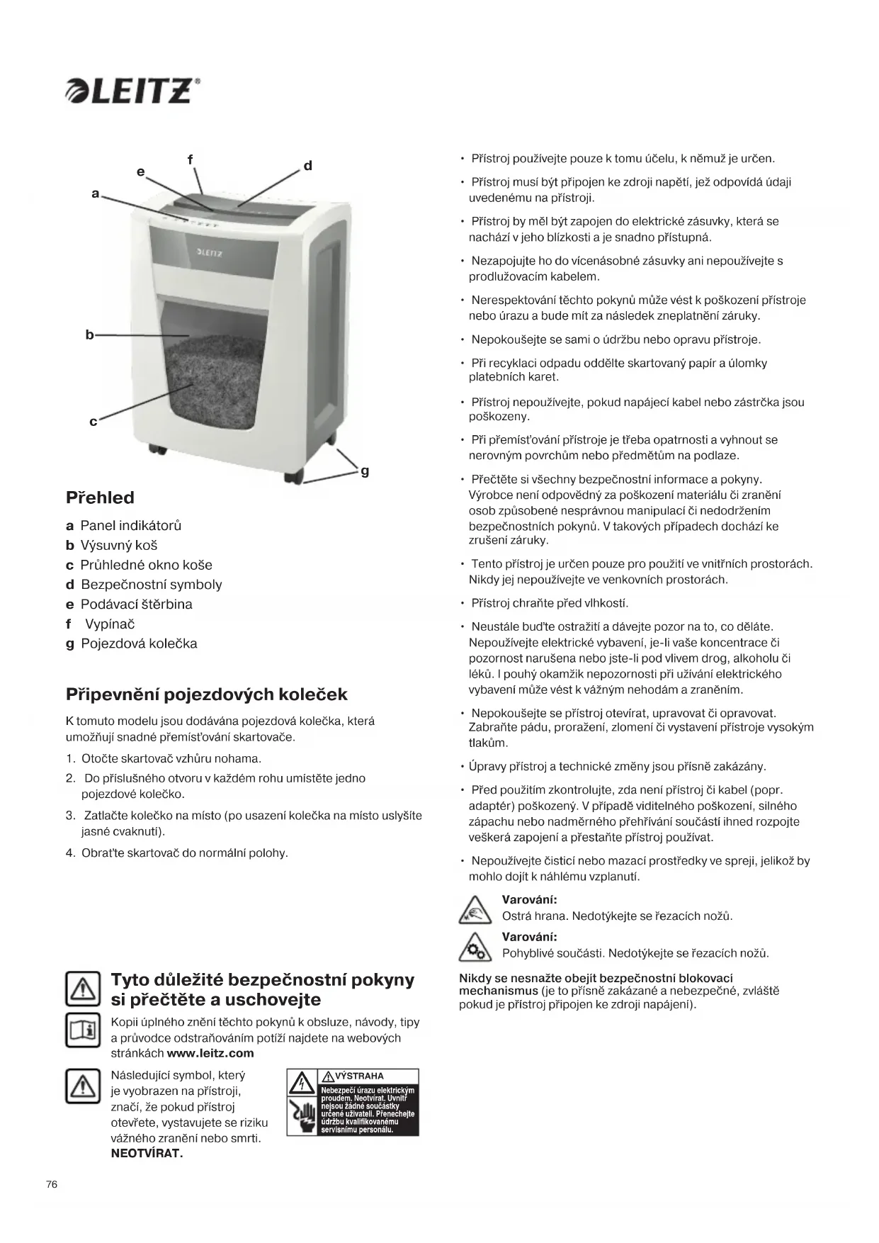 - Nepoužívejte čisticí nebo mazací prostředky ve spreji, jelikož by mohlo dojít k náhlému vzplanutí. Tyto důležité bezpečnostní pokyny si přečtěte a uschovejte Kopii úplného znění těchto pokynů k obsluze, návody, tipy a průvodce odstraňováním potíží najdete na webových stránkách www.leitz.com Následující symbol, který je vyobrazen na přístroji, značí, že pokud přístroj otevřete, vystavujete se riziku vážného zranění nebo smrti. NEOTVÍRAT. Nebezpečí úrazu elektrickým proudem. Neotvírat. Uvnitř nejsou žádné součástky určené uživateli. Přenechejte údržbu kvalikovanému servisnímu personálu. VÝSTRAHA