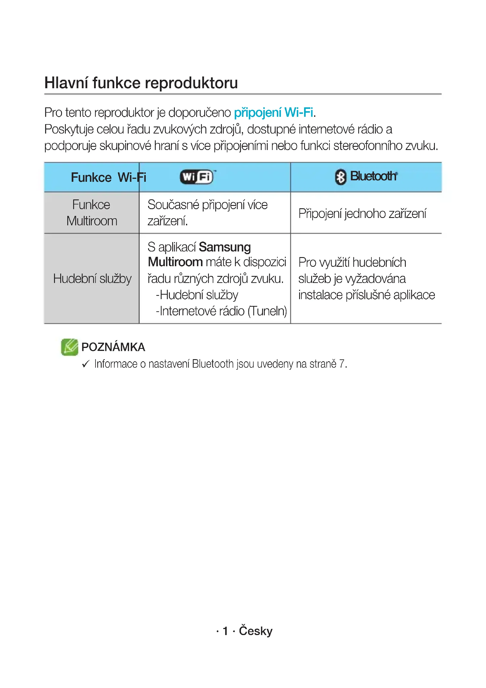 Ako se povezivanje ne može obaviti, pogledajte odjeljak „Popis za provjeru prije povezivanja” na stranicama 9 i 10. WAM3501-EN_15p-CRO-QSG_0901.indd 15 2016-09-01 4:48:15· 1 · Česky Hlavní funkce reproduktoru Pro tento reproduktor je doporučeno připojení Wi-Fi. Poskytuje celou řadu zvukových zdrojů, dostupné internetové rádio a podporuje skupinové hraní s více připojeními nebo funkci stereofonního zvuku. Funkce Wi-Fi Bluetooth Funkce Multiroom Současné připojení více zařízení. Připojení jednoho zařízení Hudební služby S aplikací Samsung Multiroom máte k dispozici řadu různých zdrojů zvuku. - Hudební služby - Internetové rádio (Tuneln) Pro využití hudebních služeb je vyžadována instalace příslušné aplikace POZNÁMKA