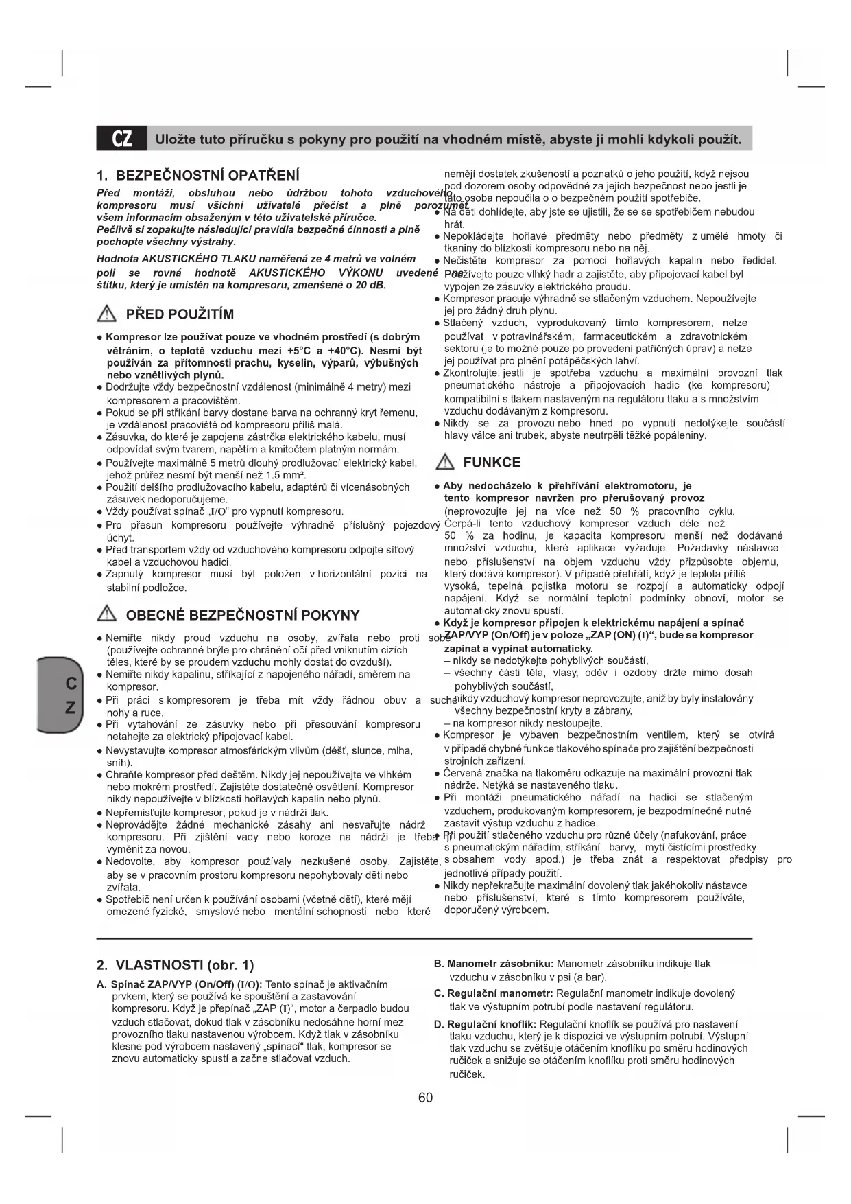 Rři použití stlačeného vzduchu pro různé účely (nafukování, práce s pneumatickým nářadím, stříkání barvy, mytí čistícími prostředky (e, s obsahem vody apod.) je třeba znát a respektovat předpisy pro jednotlivé případy použití. - Nikdy nepřekračujte maximální dovolený tlak jakéhokoliv nástavce nebo příslušenství, které s tímto kompresorem používáte, doporučený výrobcem.