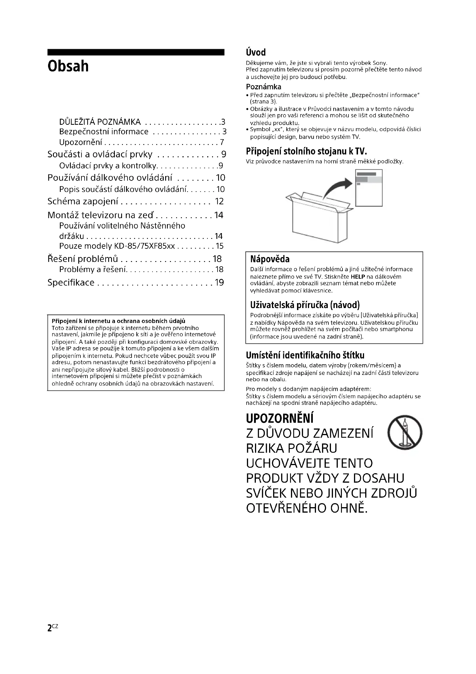 OTEVŘENÉHO OHNĚ. Připojení k internetu a ochrana osobních údajůToto zařízení se připojuje k internetu během prvotního nastavení, jakmile je připojeno k síti a je ověřeno internetové připojení. A také později při konfiguraci domovské obrazovky. Vaše IP adresa se použije k tomuto připojení a ke všem dalším připojením k internetu. Pokud nechcete vůbec použít svou IP adresu, potom nenastavujte funkci bezdrátového připojení a ani nepřipojujte síťový kabel. Bližší podrobnosti o internetovém připojení si můžete přečíst v poznámkách ohledně ochrany osobních údajů na obrazovkách nastavení. Nápověda Další informace o řešení problémů a jiné užitečné informace naleznete přímo ve své TV. Stiskněte HELP na dálkovém ovládání, abyste zobrazili seznam témat nebo můžete vyhledávat pomocí klávesnice. Uživatelská příručka (návod) Podrobnější informace získáte po výběru [Uživatelská příručka] z nabídky Nápověda na svém televizoru. Uživatelskou příručku můžete rovněž prohlížet na svém počítači nebo smartphonu (informace jsou uvedené na zadní straně).3