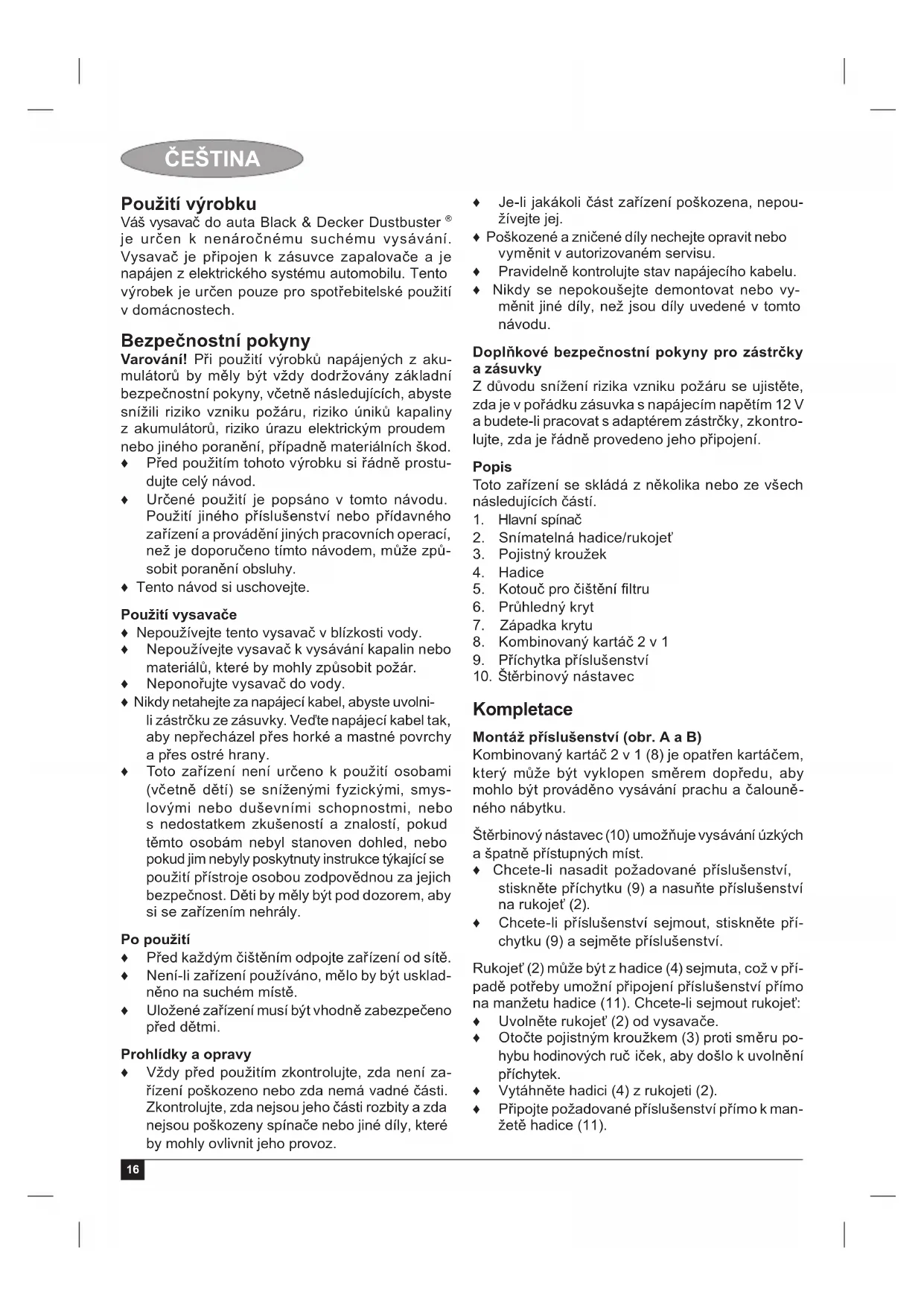 Kompletace Montáž příslušenství (obr. A a B) Kombinovaný kartáč 2 v 1 (8) je opatřen kartáčem, který může být vyklopen směrem dopředu, aby mohlo být prováděno vysávání prachu a čalouně- ného nábytku. Štěrbinový nástavec (10) umožňuje vysávání úzkých a špatně přístupných míst. ♦ Chcete-li nasadit požadované příslušenství, stiskněte příchytku (9) a nasuňte příslušenství na rukojeť (2). ♦ Chcete-li příslušenství sejmout, stiskněte pří- chytku (9) a sejměte příslušenství. Rukojeť (2) může být z hadice (4) sejmuta, což v pří- padě potřeby umožní připojení příslušenství přímo na manžetu hadice (11). Chcete-li sejmout rukojeť: ♦ Uvolněte rukojeť (2) od vysavače. ♦ Otočte pojistným kroužkem (3) proti směru po- hybu hodinových ruč iček, aby došlo k uvolnění příchytek. ♦ Vytáhněte hadici (4) z rukojeti (2). ♦ Připojte požadované příslušenství přímo k man- žetě hadice (11).17 ČEŠTINA Chcete-li rukojeť znovu nasadit: ♦ Odpojte příslušenství od hadice. ♦ Zasuňte hadici (4) do rukojeti (2). Otočte pojist- ným kroužkem (3) ve směru pohybu hodinových ručiček tak, aby došlo k jeho řádnému zajištění. Použití Připojení ke zdroji pomocí zástrčky pro příslu- šenství s napájecím stejnosměrným napětím 12 V (obr. C a D) Poznámka: Kolík zástrčky je kladný (+) a boční kontakt je záporný (-). ♦ Vyjměte zástrčku pro příslušenství s napájecím stejnosměrným napětím 12 V (12) z držáku (13), který se nachází v základně vysavače. ♦ Uvolněte příchytku kabelu (14) z úložného místa kabelu. ♦ Odviňte z úložného místa (15) celou délku na- pájecího kabelu. ♦ Zasunutím zástrčky pro příslušenství s napá- jecím stejnosměrným napětím 12 V (12) přímo do zásuvky pro příslušenství ve vozidle nebo do zásuvky jiného zdroje stejnosměrného napětí připojte vysavač ke zdroji napětí. Poznámka: U některých vozidel je zásuvka příslu- šenství funkční pouze v případě, je-li klíček zapalo- vání v poloze pro příslušenství (accessory). Varování! Nepoužívejte toto zařízení s elektrickými systémy, které jsou uzemněny na kladný pól (nap ří- klad starší vozidla). Varování! Připojení s opačnou polaritou způsobí přepálení pojistky a může způsobit trvalé poškození zařízení. ♦ Po ukončení práce s vysavačem: ♦ Odpojte zástrčku pro příslušenství s napájecím stejnosměrným napětím 12 V (12) od zdroje s napájecím napětím 12 V. ♦ Sviňte napájecí kabel, uložte jej do úložného prostoru (15) a proveďte jeho zajištění pomocí příchytky (14). ♦ Uložte zástrčku pro příslušenství s napájecím stejnosměrným napětím 12 V (12) do držáku (13), který se nachází v základně vysavače. Zapnutí a vypnutí ♦ Chcete-li vysavač zapnout, posuňte hlavní spínač (1) doprava. ♦ Chcete-li vysavač vypnout, posuňte hlavní spínač (1) doleva tak, aby došlo k jeho řádnému nastavení do polohy vypnuto (Off). Vysavač může být používán až 30 minut, aniž by došlo k nápadnému poklesu výkonu standardně nabitého akumulátoru vozidla, pokud je tento aku- mulátor v dobrém provozním stavu. Varování! Delší používání snižuje výkon akumulá- toru. Během vysávání nespouštějte motor vozidla, snížila by se tak životnost vysavače. Vysávání ♦ Při práci s vysavačem se ujistěte, zda není sací hadice uzavřena, zkroucena nebo zablokována. ♦ Z vysavače může být snadno sejmuta rukojeť (2), což prodlouží dosah hadice až do vzdále- nosti 1,5 m od vysavače. ♦ Je-li rukojeť (2) sejmuta, vysavač může být přenášen pomocí zabudované rukojeti. ♦ Rukojeť (2) může být z hadice (4) také sejmuta, což v případě potřeby umožní připojení příslu- šenství přímo na manžetu hadice (11). Rady pro optimální použití ♦ Pokud vysáváte schodiště, vždy začínejte dole a postupujte směrem nahoru. Optimální sací výkon Pokud chcete udržet optimální sací výkon, musíte během používání vysavače pravidelně čistit fi ltr. ♦ Otočte kotoučem čištění fi ltru (5) o dvě otáčky ve sm ěru pohybu hodinových ručiček, aby došlo k odstranění nečistot z fi ltrů. ♦ Čištění fi ltru jemných prachových částic musí být prováděno pravidelně, viz část „Čištění fi ltru jemných prachových částic“. Čištění a údržba Vaše nářadí Black & Decker bylo zkonstruováno tak, aby vám sloužilo dlouhou dobu s minimálními nároky na údržbu. Řádná péče o nářadí a jeho pravidelné čištění vám zajistí jeho bezproblémový chod. Varování! Před zahájením jakékoli údržby nebo čištění odpojte zařízení od elektrické zásuvky. Občas zařízení otřete navlhčeným hadříkem. Nepoužívejte žádné agresivní nebo rozpouštěcí čisticí prostředky. Neponořujte zařízení do vody. Vyprázdnění zásobníku vysavače (obr. E) Zásobník vysavače musí být vyprázdněn pravidelně, nejlépe po ukončení každého vysávání. ♦ Uvolněte západku krytu (7) a otevřete průhledný kryt (6) o 180° tak, aby došlo k jeho zajištění v otevřené poloze. ♦ Vyjměte fi ltr (16). ♦ Vyprázdněte zásobník. ♦ Vyčistěte fi ltr (16) lehkým poklepem o nádobu pro odpadky. ♦ Vložte fi ltr (16) na původní místo.