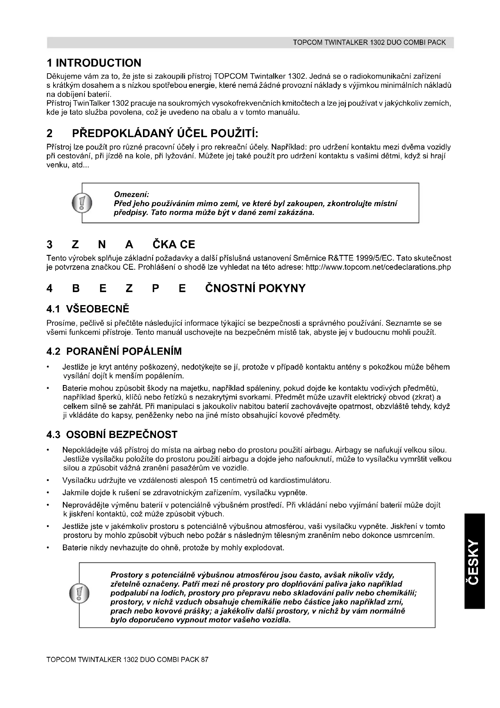 ČESKY 1 INTRODUCTION Děkujeme vám za to, že jste si zakoupili přístroj TOPCOM Twintalker 1302. Jedná se o radiokomunikační zařízení s krátkým dosahem a s nízkou spotřebou energie, které nemá žádné provozní náklady s výjimkou minimálních nákladů na dobíjení baterií. Přístroj TwinTalker 1302 pracuje na soukromých vysokofrekvenčních kmitočtech a lze jej používat v jakýchkoliv zemích, kde je tato služba povolena, což je uvedeno na obalu a v tomto manuálu. 2PŘEDPOKLÁDANÝ ÚČEL POUŽITÍ: Přístroj lze použít pro různé pracovní účely i pro rekreační účely. Například: pro udržení kontaktu mezi dvěma vozidly při cestování, při jízdě na kole, při lyžování. Můžete jej také použít pro udržení kontaktu s vašimi dětmi, když si hrají venku, atd...