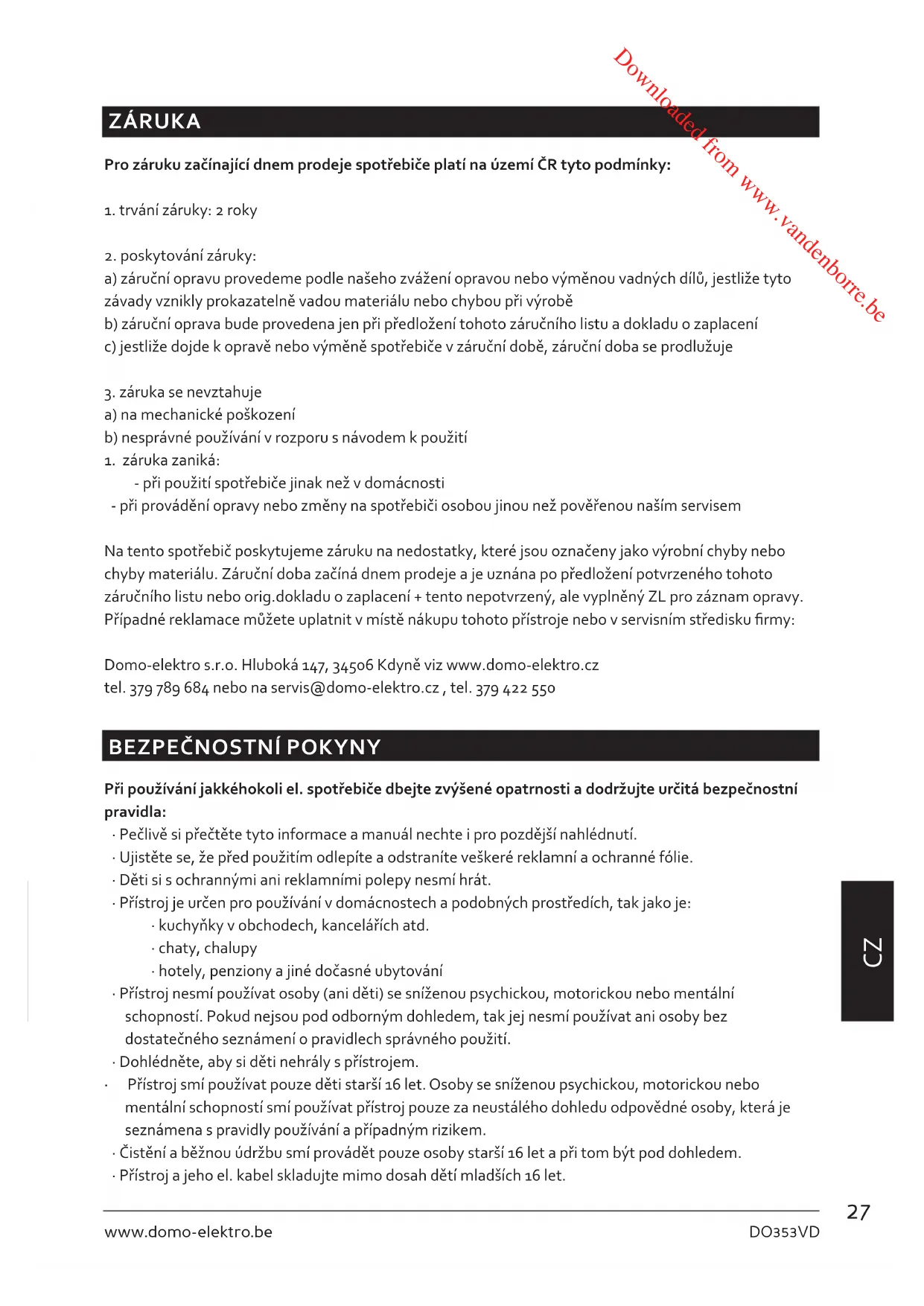 Symbol na přístroji či na jeho obalu znamená, že s tímto výrobkem není možno nakládat jako s běžným domovním odpadem, nýbrž musí být odevzdán na místech určených ke sběru a likvidaci elektrických a elektronických zařízení. Dodržením tohoto doporučení chráníte životní prostředí a zdraví spoluobčanů. Více informací o možnostech likvidace nebezpečného odpadu obdržíte na obecních nebo městských úřadech, sběrných dvorech nebo v prodejně, kde jste přístroj zakoupili. Obalové materiály jsou recyklovatelné, nakládejte s nimi podle předpisů pro životní prostředí. Downloaded from www.vandenborre.be31 DO353VD www.domo-elektro.be