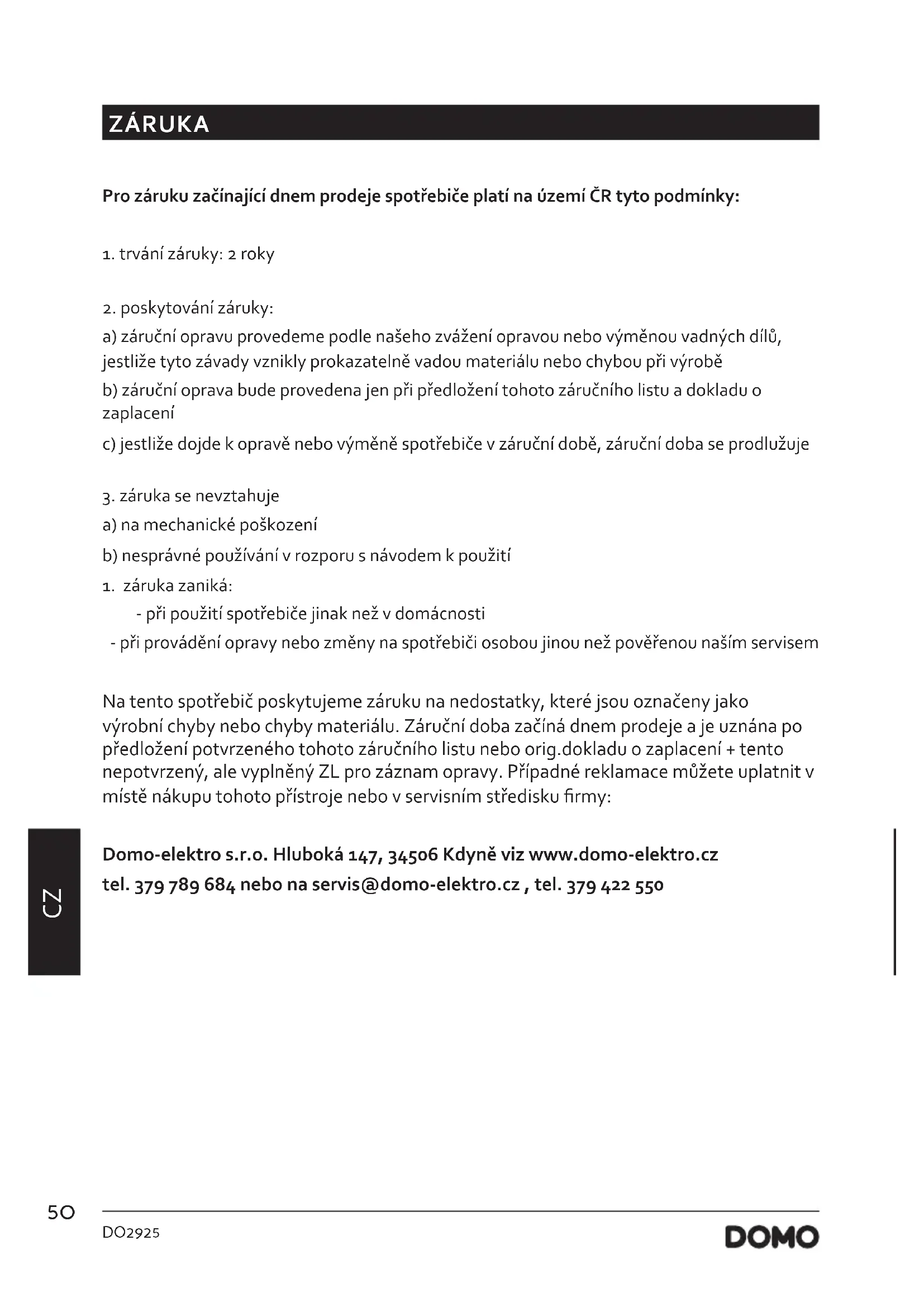 - při použití spotřebiče jinak než v domácnosti - při provádění opravy nebo změny na spotřebiči osobou jinou než pověřenou naším servisem Na tento spotřebič poskytujeme záruku na nedostatky, které jsou označeny jako výrobní chyby nebo chyby materiálu. Záruční doba začíná dnem prodeje a je uznána po předložení potvrzeného tohoto záručního listu nebo orig.dokladu o zaplacení + tento nepotvrzený, ale vyplněný ZL pro záznam opravy. Případné reklamace můžete uplatnit v místě nákupu tohoto přístroje nebo v servisním středisku rmy: Domo-elektro s.r.o. Hluboká 147, 34506 Kdyně viz www.domo-elektro.cz tel. 379 789 684 nebo na servis@domo-elektro.cz , tel. 379 422 55051 DO2925 www.domo-elektro.be
