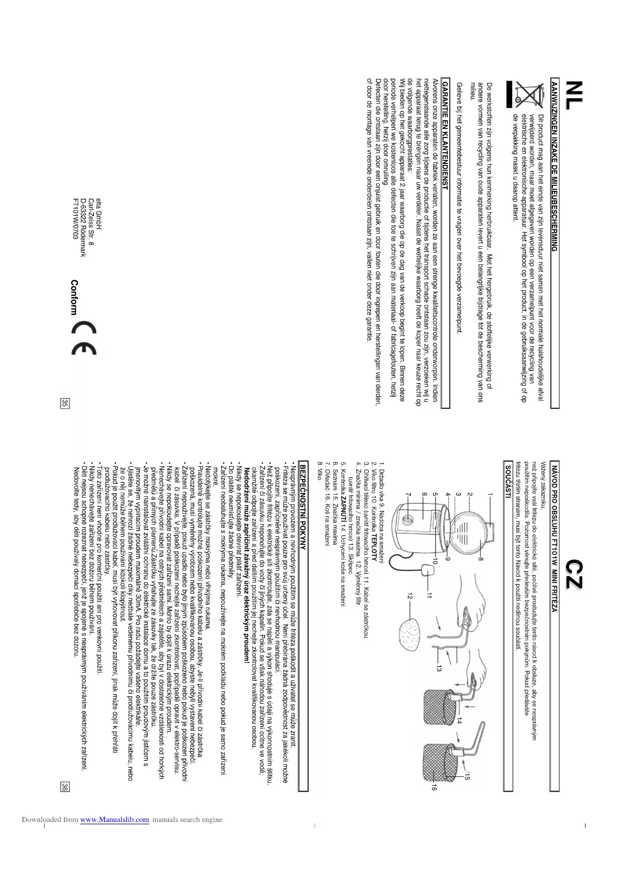 Naše zařízení podléhají před vyexpedování přísné kontrole kvality. I když napříč veškeré starostlivosti během výrobynebo během přepravy dojde k poškození, žádáme vás, aby jste se obrátili na zákaznický servis Elta (tel.0800/555510). Mimo nároků vyplývajících ze zákonné záruky má kupující garanční nárok: Pro zakoupený přístroj poskytujeme 24-měsíční lhůtu, (přiložený garanční list), která se začíná dnem zakoupení přístroje. Během této doby bezplatně odstraňujeme opravou nebo výměnou všechny nedostatky, které jsou prokazatelně chybami materiálu nebovýroby. Nedostatky v důsledku nepřiměřeného zacházení s přístrojem a chyby, které vyplívají ze zásahů nebo oprav,případně z instalace jiných nebo cizích částí, nespadají do působnosti této záruky.Amboss EuropeKrušnohorská 788CZ-36301 Ostrov u. Karl. VarůTALIMAT EL KITABIFT101W MINI FRITÖZSayýn Müþterimiz;Lütfen, yanlýþ kullanýmdan doðacak hasarlarý önlemek için, aygýtý þehir þebekesine baðlamadan önce, tüm “Kullaným Talimatname”sini dikkatlice okuyunuz. Lütfen, güvenlik bilgilerine azami dikkat gösteriniz. Eðer aleti, 3. kiþilerin kullanýmýna verirseniz, “Kullaným Talimatname”sini de o kiþiye veriniz.MONTAJ1. Kapak kulpu 9. Kýzartma bölümü2. Filtre kapaðý 10. ISI göstergesi3. Isý elementi (fritözün içinde) 11. Elektrik fiþi ve kablosu4. Minimum iþareti / maksimum iþareti 12. Yedek filtre (fritözün içinde) 13. Tutucu 5. GÜÇ göstergesi 14. Kýzartma sepet sürgüsü6. Ýndeks 15. Maksimum iþareti7. Kontrol 16. Piþirme sepeti8. KapakGUVENLIK BILGISI• Yanlýþ veya hatalý kullaným alete zarar verebilir yada kullanýcýnýn yaralanmasýna yol açabilir.