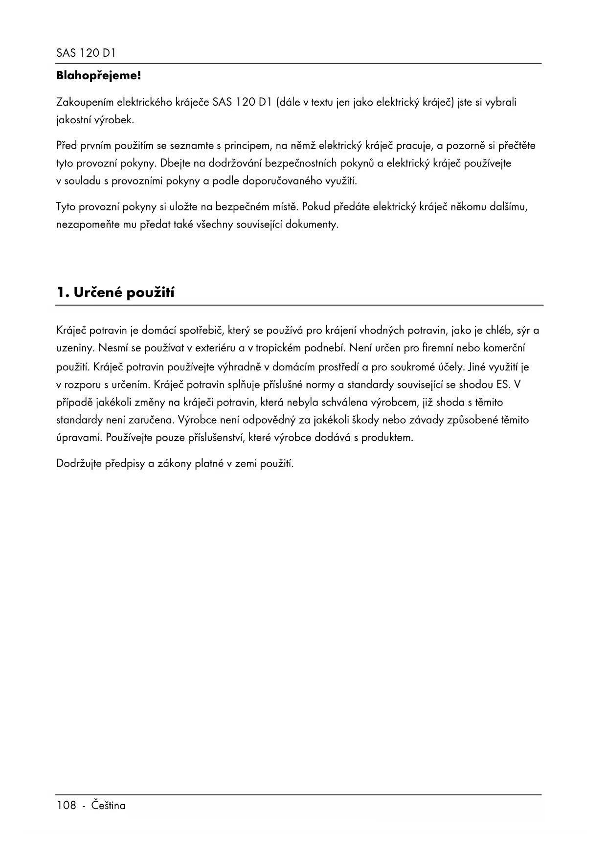 Blahopřejeme! Zakoupením elektrického kráječe SAS 120 D1 (dále v textu jen jako elektrický kráječ) jste si vybrali jakostní výrobek. Před prvním použitím se seznamte s principem, na němž elektrický kráječ pracuje, a pozorně si přečtěte tyto provozní pokyny. Dbejte na dodržování bezpečnostních pokynů a elektrický kráječ používejte v souladu s provozními pokyny a podle doporučovaného využití. Tyto provozní pokyny si uložte na bezpečném místě. Pokud předáte elektrický kráječ někomu dalšímu, nezapomeňte mu předat také všechny související dokumenty.