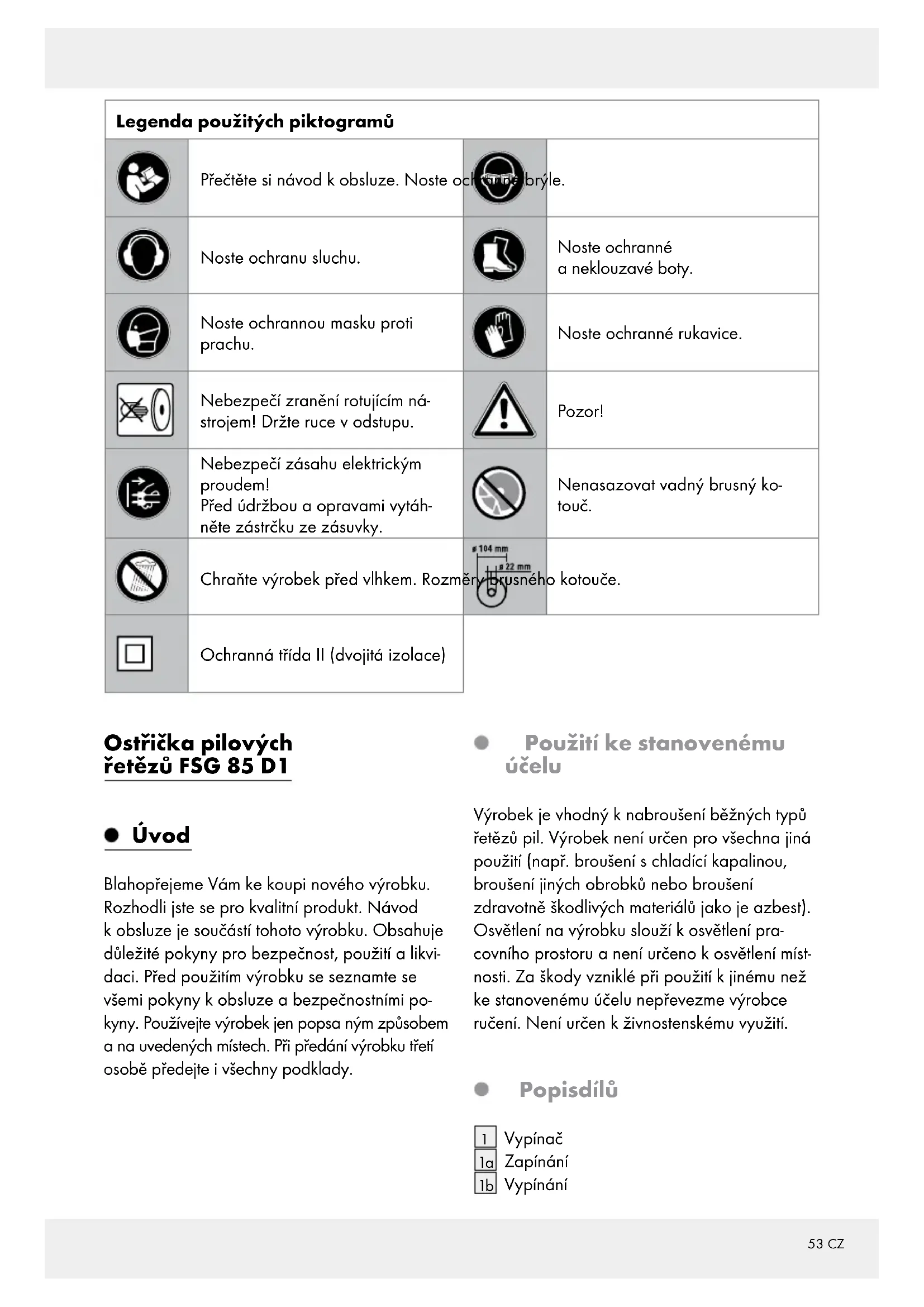 vovat vyučeným elektrikářem Tento elektrický nástroj splňuje požadavky příslušných bezpečnostních předpisů. Opravy smí provádět za použití originál- ních náhradních dílů jen vyučený elektrikář, v jiném případě může dojít k ohrožení uži- vatele. Následující zbytková rizika zůstávají, přestože byla provedená opatření vytvořením obzvlášť bezpečného designu, musí se dbát na bezpečnostní a doplňková ochranná opatření: po vypnutí nástroje brusný kotouč ještě dobíhá. Hrozí nebezpečí zranění. Doplňkové bezpečnostní informace Připojujte výrobek jen na zásuvku s proudo- vým chráničem (FI-spínač) s jmenovitým chybným proudem do 30 mA. Držte síťový a prodlužovací kabel mimo do dosah brusného kotouče a řetězu. Při po- škození nebo přeříznutí ihned vytáhněte zá- strčku ze zásuvky. Nedotýkejte se kabelu dokud není odpojen od přívodu elektric- kého proudu. Nebezpečí zásahu elektric- kým proudem! Před použitím zkontrolujte vizuálně brusný kotouč. Nepoužívejte brusný kotouč s odštěpeným materiálem, trhlinami nebo jiným poškoze- ním. Opotřebovaný brusný kotouč vyměňte. Nikdy nepoužívejte výrobek bez průhled- ného krytu. Nepracujte s výrobkem, jestliže jste unavení nebo po požití alkoholu anebo léků. Udě- lejte si vždy včas pracovní přestávku. Nepoužívejte výrobek ve výbušné prostředí nebo tam, kde mohou jiskry zapříčinit57 CZ požár, výbuch atd.. Při nerespektování hrozí nebezpečí požáru nebo výbuchu. Zajistěte aby byla při práci způsobující prach otevřená větrání. Za provozu výrobku držte Vaše ruce mimo dosah brusného kotouče a zubů řetězu. Nepohybujte řetězem rukama. Hrozí nebez- pečí zranění. Nestrkejte nikdy prsty mezi brusný kotouč a otočný talíř nebo mezi brusný kotouč a prů- hledný kryt. Hrozí nebezpečí uskřípnutí. Řetěz je při broušení horký. Nedotýkat se obrobeného místa, hrozí nebezpečí popá- lení. Používejte jen brusné kotouče doporučené výrobcem. Nepožívejte řezací kotouče. Vypněte výrobek a vytáhněte zástrčku ze zásuvky - pro uvolnění zablokovaného nástroje, - při poškození nebo zamotání přívodního kabelu, - při neobvyklých zvucích. Před uvedením do provozu Upozornění: Prosíme, odstraňte úplně obalový materiál. Obsluha by měla stát při používání blízko výrobku, natažení těla může vést k nejisté poloze resp. postoji. Montáž Upozornění: připevňujte výrobek vždy jen dodanými šrouby (M10 x 60). Dávejte pozor na dostatečný prostor pro práci a bezpečnost jiných osob. Připevňujte výrobek šrouby dostatečné délky a průměru, aby nedošlo ke ztrátě kontroly nad výrobkem. Postavení výrobku (viz obr. B) - Tloušťka použité hrany stolu: 15–30 mm - průměr vrtáku: 10,5 mm - šrouby: M10 Umístěte výrobek zářezy