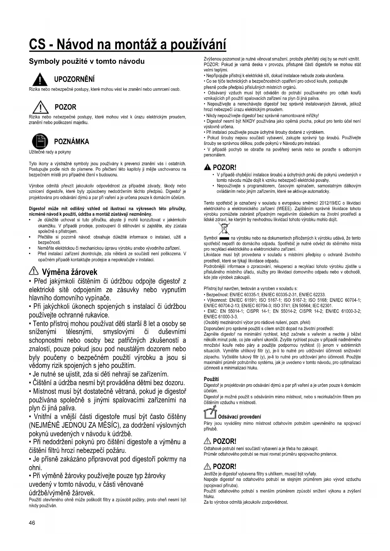 innosti a minimalizaci hluku. Použití Digestoř je projektován pro odsávání dýmů a par při vaření a je určen pouze k domácím účelům. Digestoř je možné použít s odsáváním mimo místnost, nebo s recirkulačním filtrem pro čištěním vzduchu v místnosti. Odsávací provedení Páry jsou vyváděny mimo místnost odtahovím potrubím upevněného na spojovací přírubě. POZOR! Odtahové potrubí není součástí vybavení a je třeba ho zakoupit. Průměr odtahového potrubí se musí rovnat průměru spojovacího prstence. POZOR! Jestliže je digestoř vybavena filtry s uhlíkem, musejí být vyňaty. Napojte digestoř na odtahového potrubí se stejným průměrem jako vývod vzduchu (spojovací příruba). Použití odtahového potrubí s menším průměrem způsobí snížení výkonu a zvýšení hluku. Za to výrobce odmítá jakoukoliv zodpovědnost.47 ! Používejte co nejkratší odtahové potrubí. ! Používejte odtahové potrubí s co nejmenším počtem záhybů (maximální úhel záhybu: 90°). ! Vyhněte se zásadním změnám sekce vedení odtahu. Filtrační provedení Odsávaný vzduch bude před návratem do místnosti zbaven tuku a pachů. K použití digestoře v této verzi je nutné instalovat dodatečný systém filtrování na základě aktivních uhlíků.
