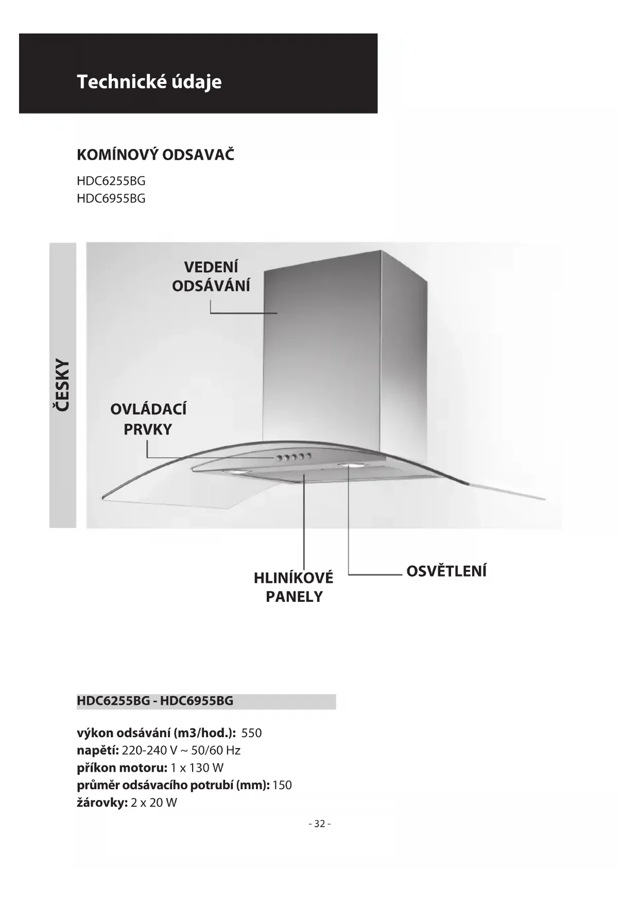 OVLÁDACÍ PRVKY HLINÍKOVÉ PANELY OSVĚTLENÍ výkon odsávání (m3/hod.): 550 napětí: 220-240 V ~ 50/60 Hz příkon motoru: 1 x 130 W průměr odsávacího potrubí (mm): 150 žárovky: 2 x 20 WČESKY