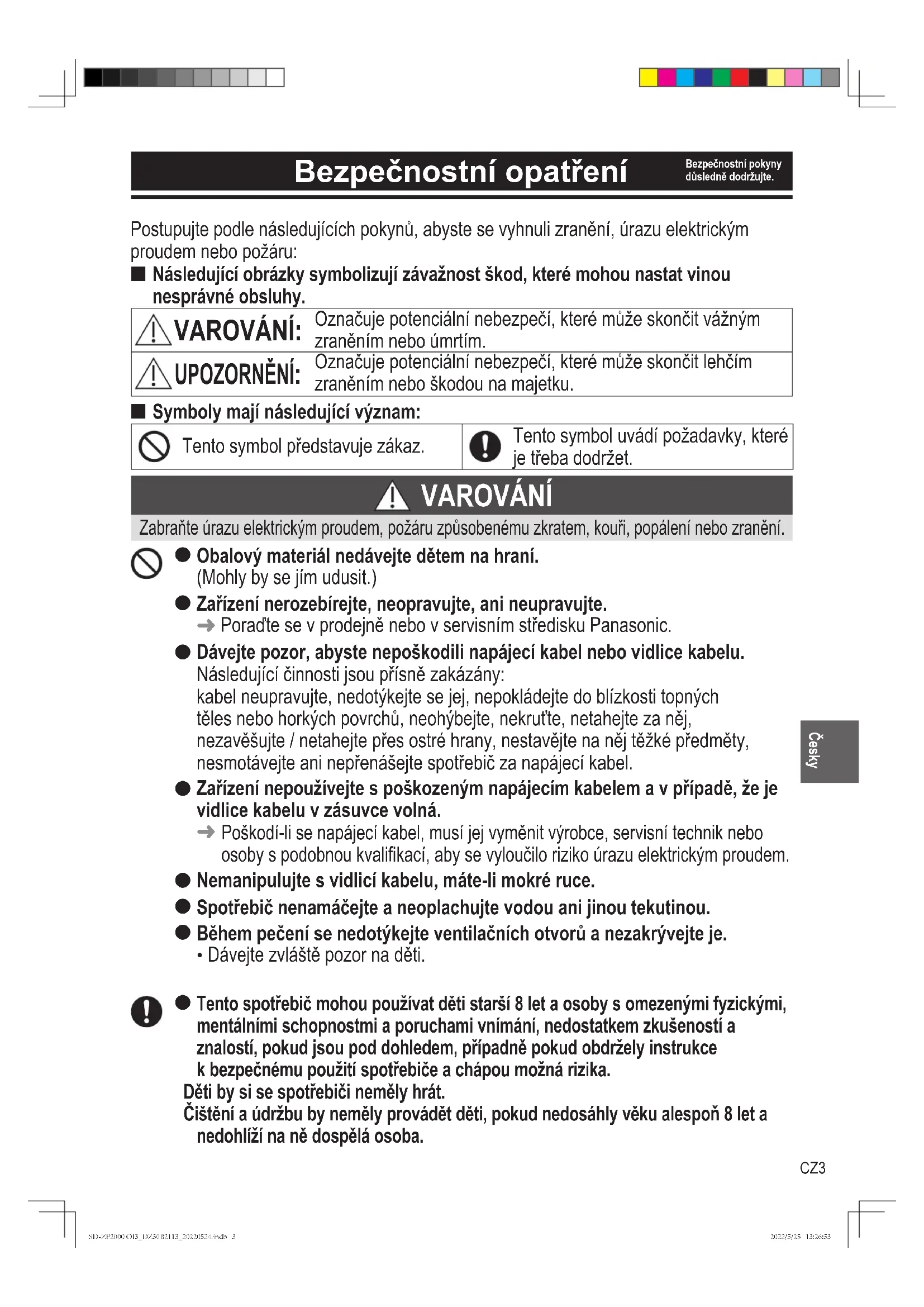 Společnost Panasonic nepřijme žádnou odpovědnost v případech, kdy bylo zařízení používáno v rozporu s tímto návodem. SD-ZP2000 OI3_DZ50B2113_20220524.indb 2SD-ZP2000 OI3_DZ50B2113_20220524.indb 2 2022/5/25 13:26:532022/5/25 13:26:53CZ3 Postupujte podle následujících pokynů, abyste se vyhnuli zranění, úrazu elektrickým proudem nebo požáru: