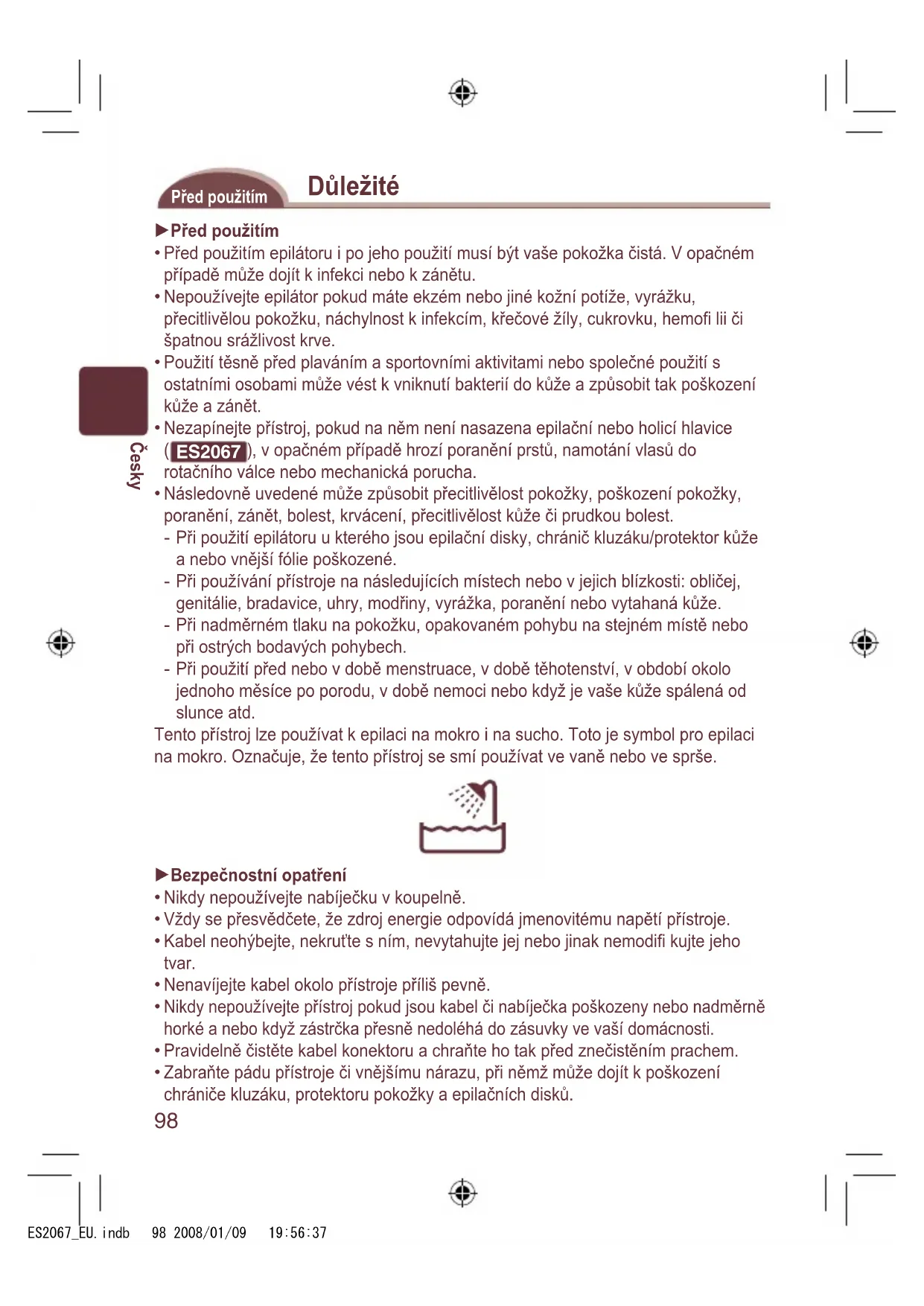 ES2067 ), v opačném případě hrozí poranění prstů, namotání vlasů do rotačního válce nebo mechanická porucha. Následovně uvedené může způsobit přecitlivělost pokožky, poškození pokožky, poranění, zánět, bolest, krvácení, přecitlivělost kůže či prudkou bolest. Při použití epilátoru u kterého jsou epilační disky, chránič kluzáku/protektor kůže a nebo vnější fólie poškozené. Při používání přístroje na následujících místech nebo v jejich blízkosti: obličej, genitálie, bradavice, uhry, modřiny, vyrážka, poranění nebo vytahaná kůže. Při nadměrném tlaku na pokožku, opakovaném pohybu na stejném místě nebo při ostrých bodavých pohybech. Při použití před nebo v době menstruace, v době těhotenství, v období okolo jednoho měsíce po porodu, v době nemoci nebo když je vaše kůže spálená od slunce atd. Tento přístroj lze používat k epilaci na mokro i na sucho. Toto je symbol pro epilaci na mokro. Označuje, že tento přístroj se smí používat ve vaně nebo ve sprše. Bezpečnostní opatření Nikdy nepoužívejte nabíječku v koupelně. Vždy se přesvědčete, že zdroj energie odpovídá jmenovitému napětí přístroje. Kabel neohýbejte, nekruťte s ním, nevytahujte jej nebo jinak nemodifi kujte jeho tvar. Nenavíjejte kabel okolo přístroje příliš pevně. Nikdy nepoužívejte přístroj pokud jsou kabel či nabíječka poškozeny nebo nadměrně horké a nebo když zástrčka přesně nedoléhá do zásuvky ve vaší domácnosti. Pravidelně čistěte kabel konektoru a chraňte ho tak před znečistěním prachem. Zabraňte pádu přístroje či vnějšímu nárazu, při němž může dojít k poškození chrániče kluzáku, protektoru pokožky a epilačních disků.