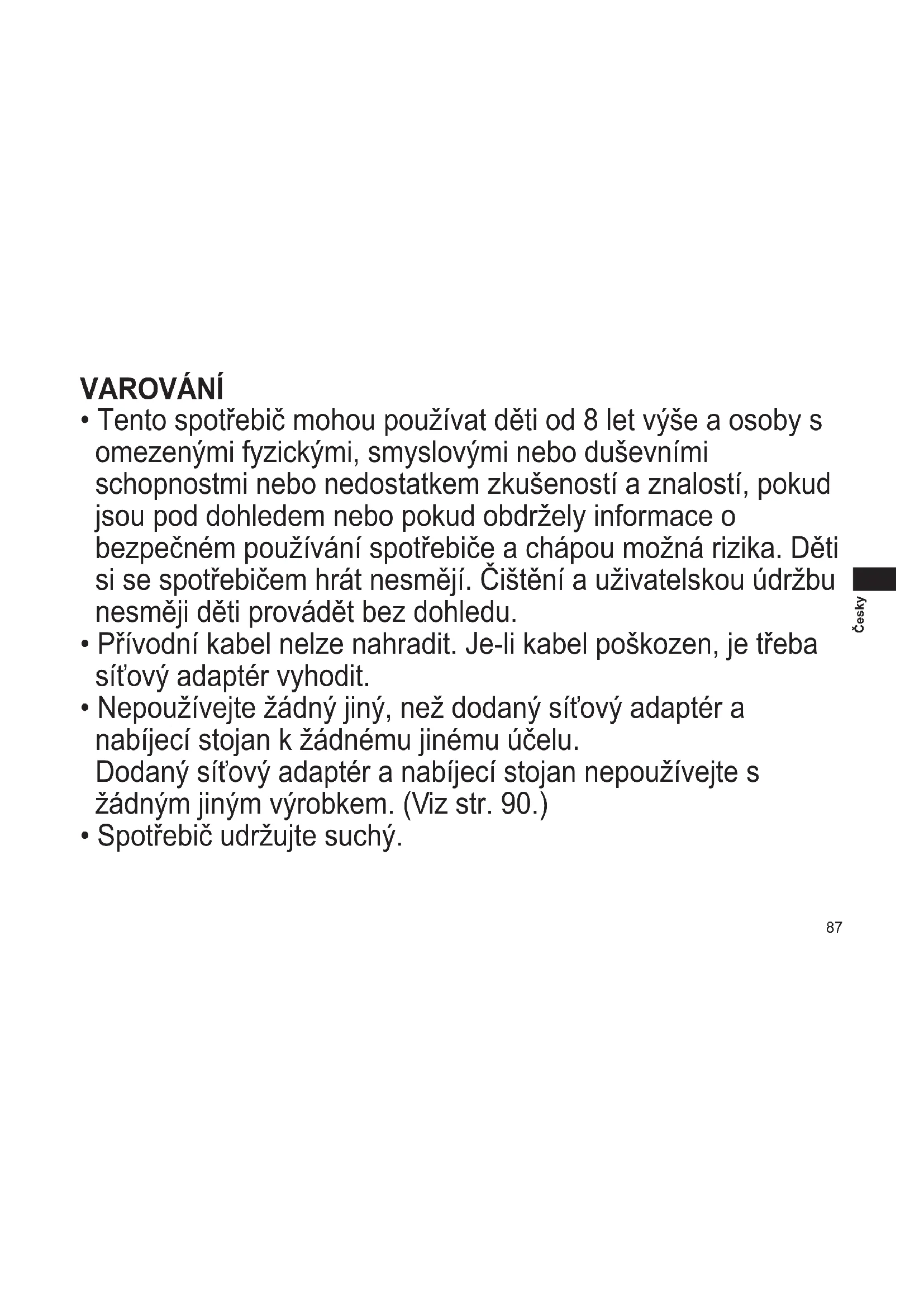- Tento spotřebič mohou používat děti od 8 let výše a osoby s omezenými fyzickými, smyslovými nebo duševními schopnostmi nebo nedostatkem zkušeností a znalostí, pokud jsou pod dohledem nebo pokud obdržely informace o bezpečném používání spotřebiče a chápou možná rizika. Děti si se spotřebičem hrát nesmějí. Čištění a uživatelskou údržbu nesměji děti provádět bez dohledu.