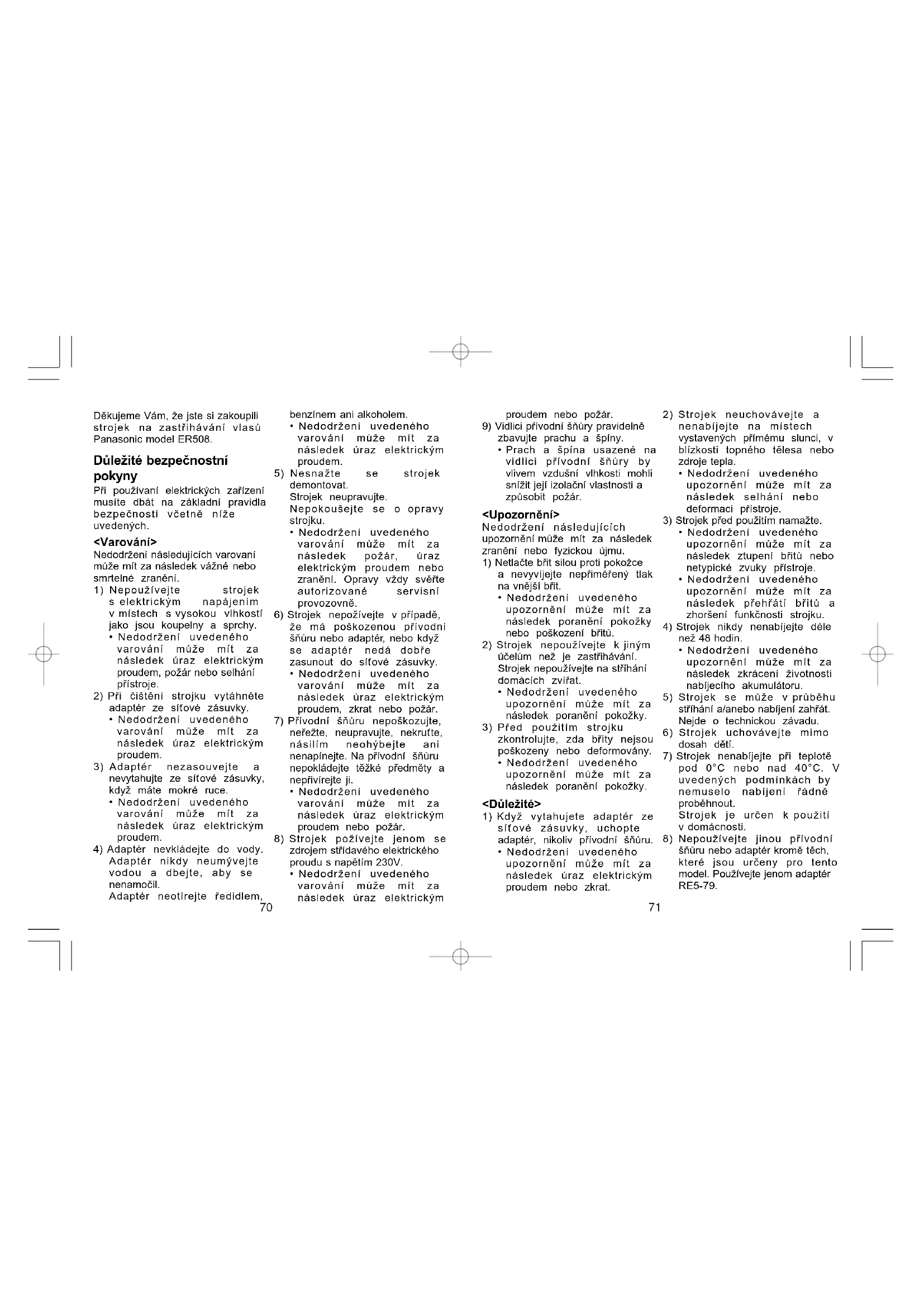 Děkujeme Vám, že jste si zakoupili strojek na zastřihávání vlasů Panasonic model ER508. Důležité bezpečnostní pokyny Při používaní elektrických zařízení musíte dbát na základní pravidla bezpečnosti včetně níže uvedených. <Varování> Nedodržení následujících varovaní může mít za následek vážné nebo smrtelné zranění.