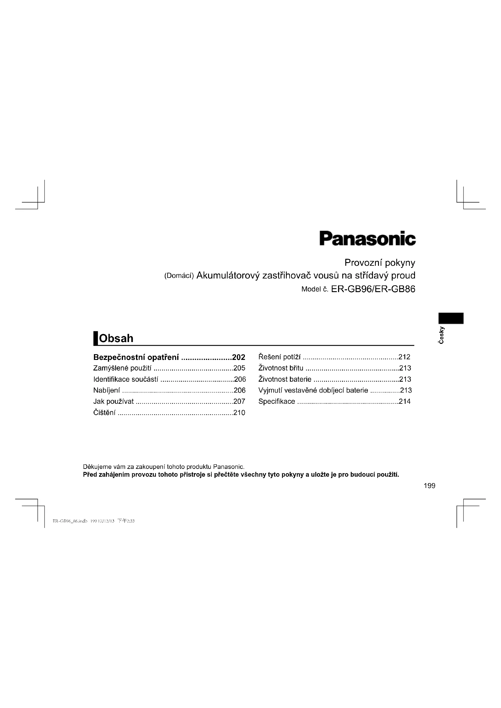 - Ochrana životního prostředí a recyklace materiálů Tento spotřebič obsahuje nikl-metalhydridovou baterii. Zajistěte likvidaci baterie na některém z ociálně určených míst, je-li takové místo k dispozici. Specikace Zdroj napájení Viz typový štítek na adaptéru střídavého proudu. (Automatický převod napětí) Napětí motoru 1,2 V Doba nabíjení Cca 1 hodina Vzduchem šířený hluk 65 (dB(A) re 1 pW) Tento produkt je určen pouze pro domácí použití. Likvidace použitých zařízení a baterií Jen pro státy Evropské unie a země s fungujícím systémem recyklace a zpracování odpadu. Tyto symboly na výrobcích, jejich obalech a v doprovodné dokumentaci upozorňují na to, že se použitá elektrická a elektronická zařízení, včetně baterií, nesmějí likvidovat jako běžný komunální odpad. Aby byla zajištěna správná likvidace a recyklace použitých výrobků a baterií, odevzdávejte je v souladu s národní legislativou na příslušných sběrných místech. Správnou likvidací přispějete k úspoře cenných přírodních zdrojů a předejdete možným negativním dopadům na lidské zdraví a životní prostředí. O další podrobnosti o sběru a recyklaci odpadu požádejte místní úřady. Při nesprávné likvidaci tohoto druhu odpadu se vystavujete postihu podle národní legislativy. Poznámka k symbolu baterie (značka pod symbolem) Tento symbol může být použitý v kombinaci s chemickou značkou. Takový případ je v souladu s požadavky směrnice pro chemické látky. ER-GB96_86.indb 214 17/12/13 下午2:33215 Slovensky Ďakujeme, že ste zakúpili výrobok značky Panasonic. Pred používaním tejto jednotky si v celom rozsahu prečítajte tento návod na obsluhu a uschovajte ho na možnú potrebu v budúcnosti. Obsah Návod na obsluhu Sieťový/nabíjateľný zastrihávač brady (na domáce použitie) Č. Modelu ER-GB96/ER-GB86 Bezpečnostné opatrenia p. 218