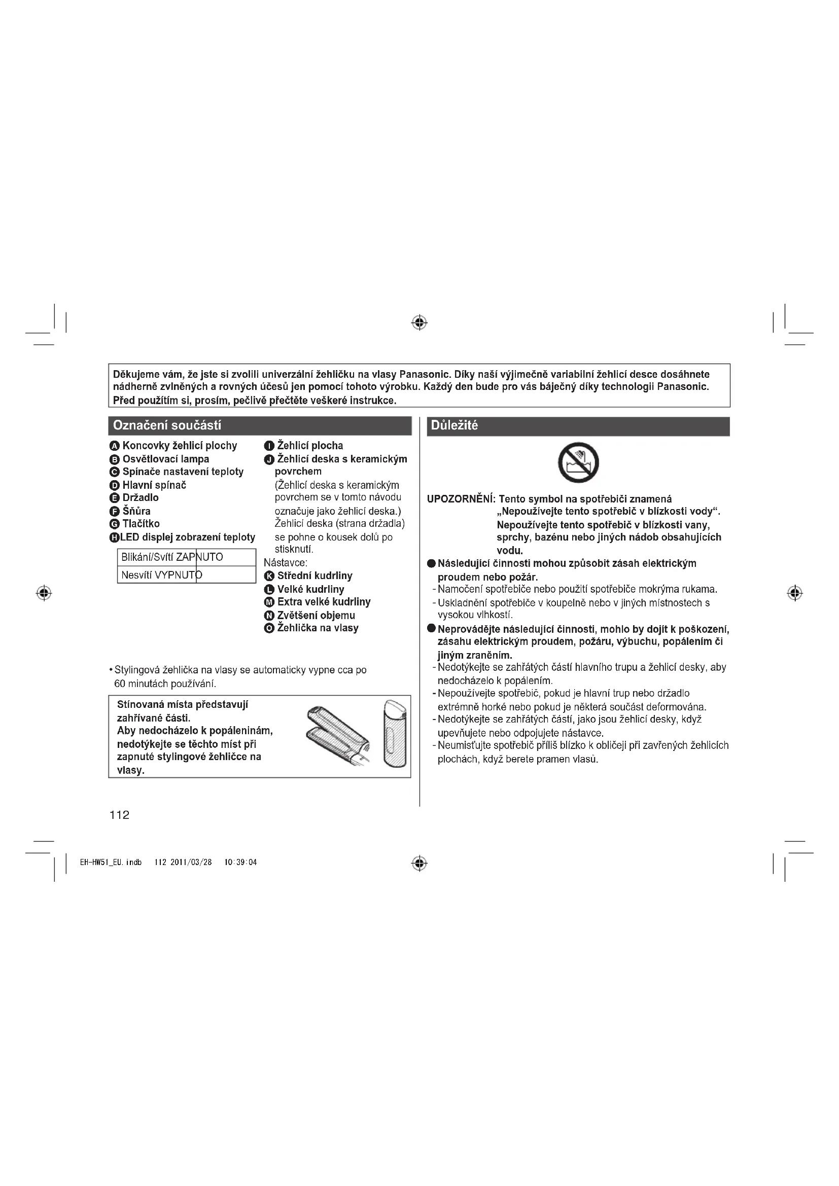 EH-HW51_EU.indb 111 2011/03/28 10:39:04112 Děkujeme vám, že jste si zvolili univerzální žehličku na vlasy Panasonic. Díky naší výjimečně variabilní žehlicí desce dosáhnete nádherně zvlněných a rovných účesů jen pomocí tohoto výrobku. Každý den bude pro vás báječný díky technologii Panasonic. Před použítím si, prosím, pečlivě přečtěte veškeré instrukce. Označení součástí