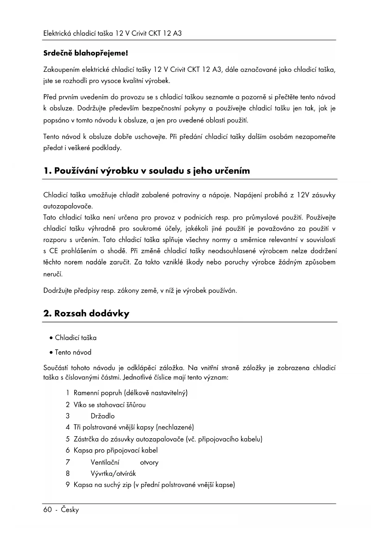 Chladicí taška Tento návod Součástí tohoto návodu je odklápěcí záložka. Na vnitřní straně záložky je zobrazena chladicí taška s číslovanými částmi. Jednotlivé číslice mají tento význam: 1 Ramenní popruh (délkově nastavitelný) 2 Víko se stahovací šňůrou 3 Držadlo 4 Tři polstrované vnější kapsy (nechlazené) 5 Zástrčka do zásuvky autozapalovače (vč. připojovacího kabelu) 6 Kapsa pro připojovací kabel 7 Ventilační otvory 8 Vývrtka/otvírák 9 Kapsa na suchý zip (v přední polstrované vnější kapse)Elektrická chladicí taška 12 V Crivit CKT 12 A3 Česky - 61