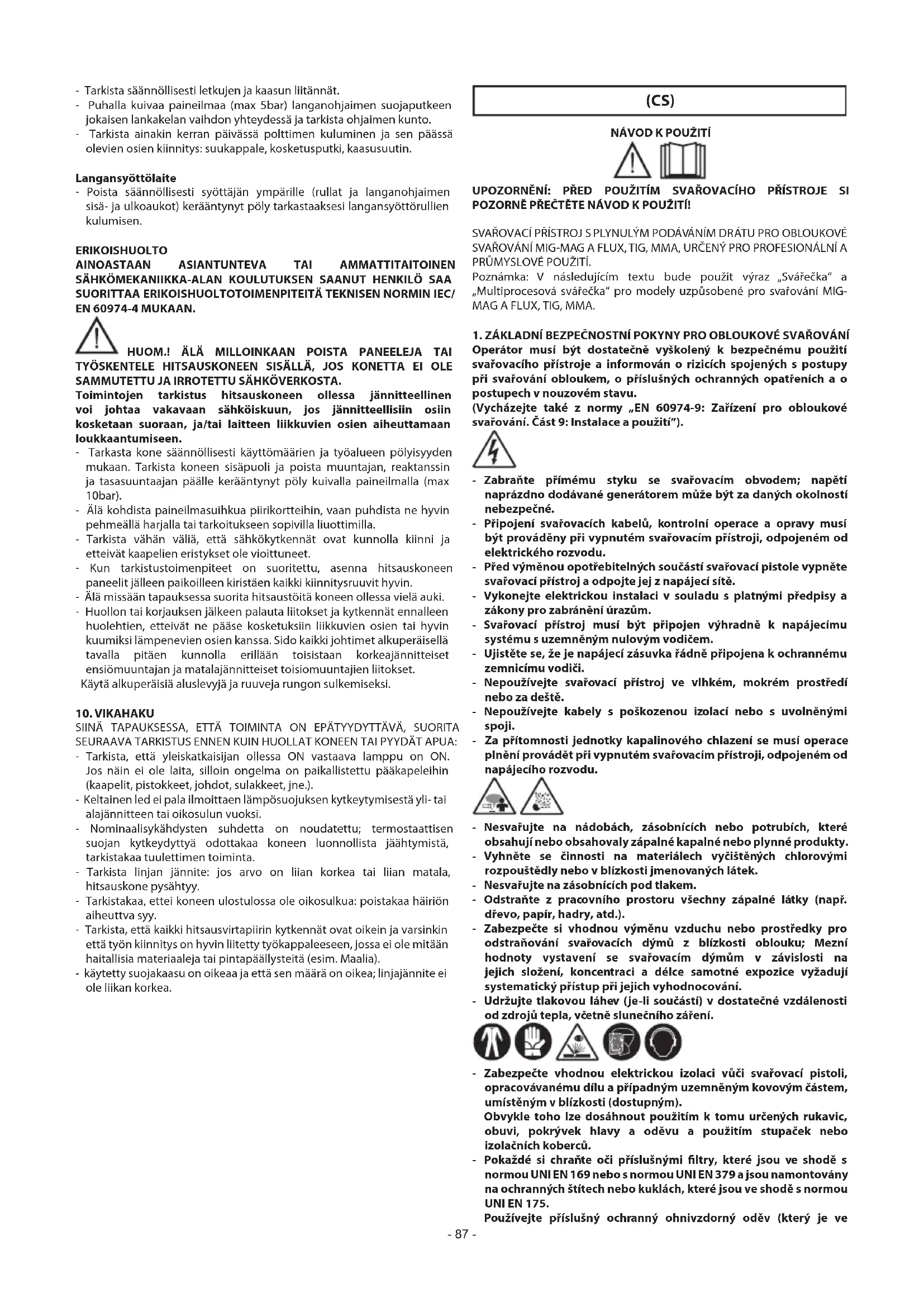 - OPERACE SVAŘOVÁNÍ: - V prostředí se zvýšeným rizikem zásahu elektrickým proudem; - ve vymezených prostorech; - v přítomnosti zápalných nebo výbušných materiálů. MUSÍ být předem zhodnoceny „Odborným vedoucím“ a vykonány pokaždé v přítomnosti osob vyškolených pro zásahy v nouzových případech. MUSÍ být přijaty technické ochranné prostředky popsané v 7.10; A.8; A.10 normy „EN 60974-9: Zařízení pro obloukové svařování. Část 9: Instalace a použití”. - Pokud pracovník obsluhy drží svařovací přístroj nebo podavač drátu (např. pomocí řemenů), MUSÍ být svařování zakázáno. - MUSÍ být zakázáno svařování operátorem zvednutým ze země, s výjimkou použití bezpečnostních plošin. - NAPĚTÍ MEZI DRŽÁKY ELEKTROD NEBO SVAŘOVACÍMI PISTOLEMI: Při práci s více svařovacími přístroji na jediném svařovaném kusu nebo na více kusech spojených elektricky může dojít k nebezpečnému součtu napětí mezi dvěma odlišnými držáky elektrod nebo se svařovacími pistolemi, s hodnotou, která může dosáhnout dvojnásobku přípustné meze. Je potřebné, aby odborník —koordinátor provedl měření přístroji, čímž se zjistí, zda existuje nebezpečí rizika, a mohla se přijmout vhodná ochranná opatření v souladu s ustanovením části 7.9 normy „EN 60974-9: Zařízení pro obloukové svařování. Část 9: Instalace a použití”. ZBYTKOVÁ RIZIKA - PŘEVRÁCENÍ: Umístěte svařovací přístroj na vodorovný povrch s nosností odpovídající dané hmotnosti; v opačném případě (např. na nakloněné, poškozené podlaze, atd.) existuje nebezpečí převrácení. - NESPRÁVNÉ POUŽITÍ: Použití svařovacího přístroje na jakékoli jiné použití než je správné použití, (např. rozmrazování potrubí vodovodního rozvodu), je nebezpečné. - PŘEMÍSTĚNÍ SVAŘOVACÍHO PŘÍSTROJE: Tlakovou láhev s plynem (používá-li se) vždy zajistěte vhodnými prostředky určenými k zabránění jejího náhodného pádu. - Je zakázáno používat rukojeť jako prostředek k zavěšení svařovacího přístroje. Před připojením svařovacího přístroje do napájecí sítě se musí všechny ochranné kryty a pohyblivé součásti obalu svařovacího přístroje a podávače drátu nacházet v předepsané poloze. UPOZORNĚNÍ! Jakýkoli manuální zásah na pohyblivých součástech podávače drátu, například: - Výměna válečků a/nebo vodiče drátu; - Zasunutí drátu do válečků; - Naložení cívky s drátem; - Vyčištění válečků, ozubených převodů a zóny pod nima; - Mazání ozubených převodů. MUSÍ BÝT VYKONÁNO PŘI VYPNUTÉM SVAŘOVACÍM PŘÍSTROJI, ODPOJENÉM OD NAPÁJECÍHO ROZVODU.