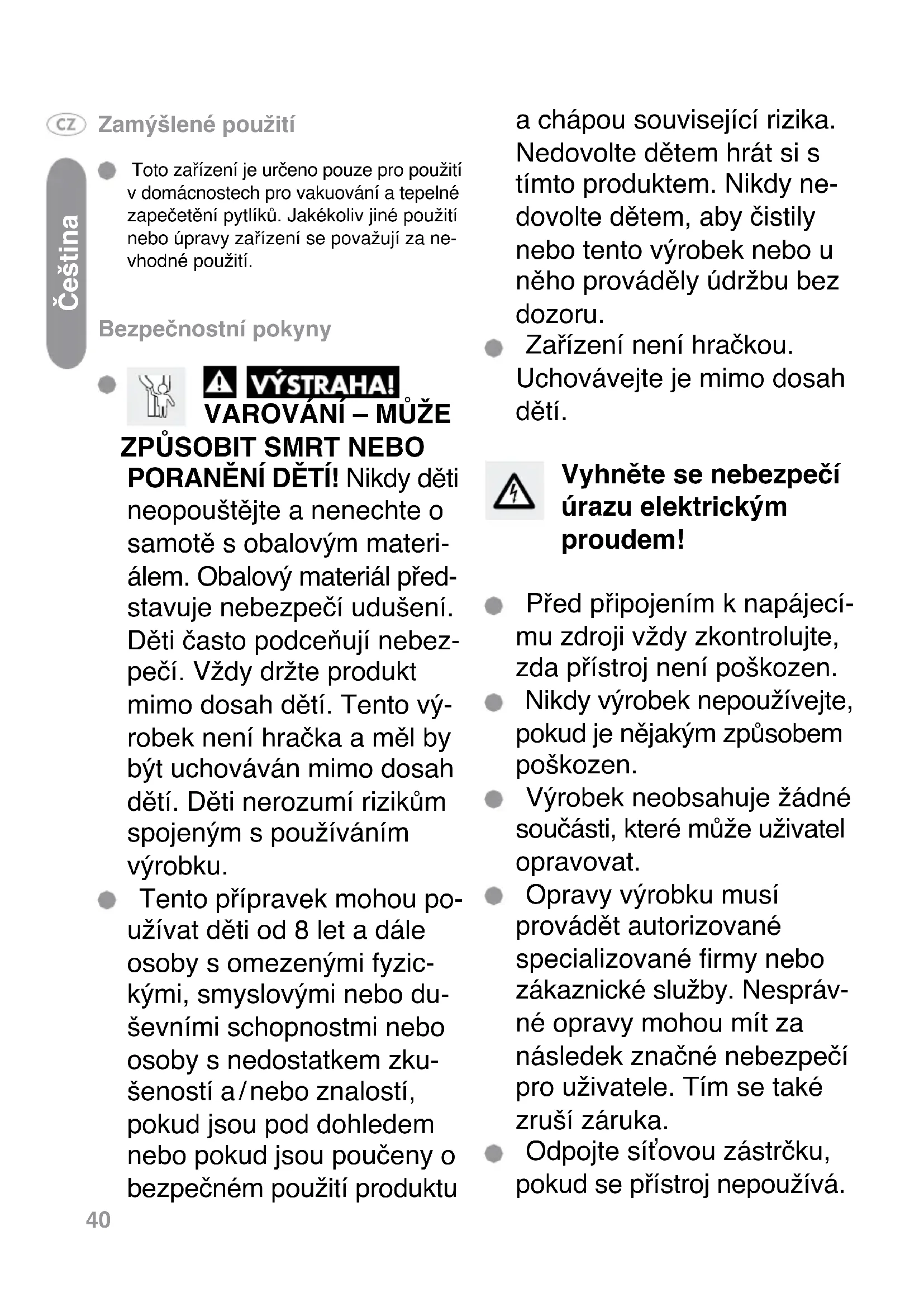 Toto zařizení je určeno pouze pro použití v domácnostech pro vakuování a tepelné zapečetení pytlíků. Jakékoliv jiné použiti nebo upravy zařizení se považuju za nevhodné použiti.