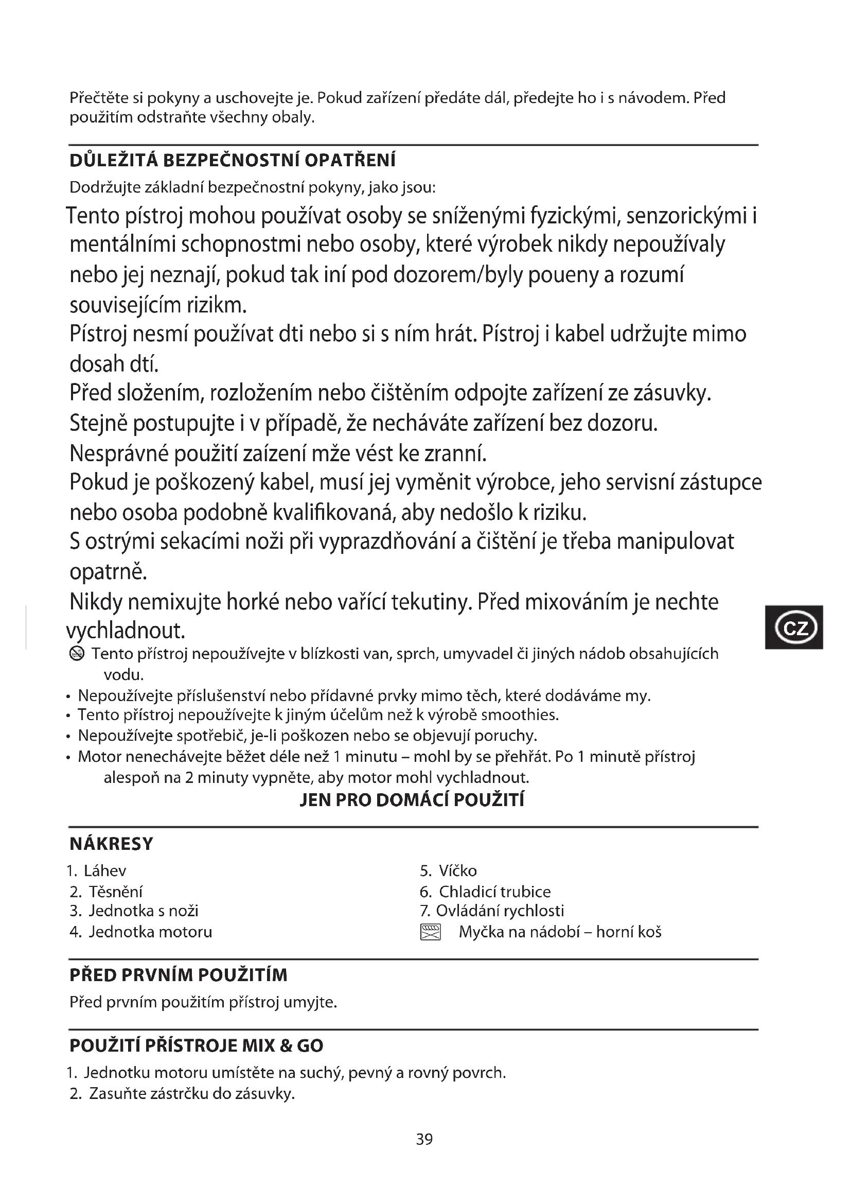 - Tento přístroj nepoužívejte k jiným účelům než k výrobě smoothies.