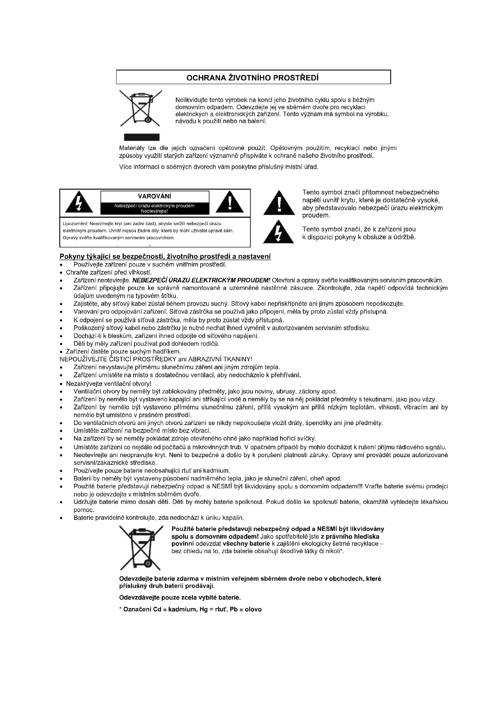 Tento symbol značí, že k zařízení jsou k dispozici pokyny k obsluze a údržbě. Pokyny týkající se bezpečnosti, životního prostředí a nastavení Používejte zařízení pouze v suchém vnitřním prostředí. Chraňte zařízení před vlhkostí. Zařízení neotevírejte. NEBEZPEČÍ ÚRAZU ELEKTRICKÝM PROUDEM! Otevření a opravy svěřte kvalifikovaným servisním pracovníkům. Zařízení připojujte pouze ke správně namontované a uzemněné nástěnné zásuvce. Zkontrolujte, zda napětí odpovídá technickým údajům uvedeným na typovém štítku. Zajistěte, aby síťový kabel zůstal během provozu suchý. Síťový kabel nepřiskřípněte ani jiným způsobem nepoškozujte. Varování pro odpojování zařízení: Síťová zástrčka se používá jako připojení, měla by proto zůstat vždy přístupná. K odpojení se používá síťová zástrčka, měla by proto zůstat vždy přístupná. Poškozený síťový kabel nebo zástrčku je nutné nechat ihned vyměnit v autorizovaném servisním středisku. Dochází-li k bleskům, zařízení ihned odpojte od síťového napájení. Děti by měly zařízení používat pod dohledem rodičů. Zařízení čistěte pouze suchým hadříkem. NEPOUŽÍVEJTE ČISTICÍ PROSTŘEDKY ani ABRAZIVNÍ TKANINY! Zařízení nevystavujte přímému slunečnímu záření ani jiným zdrojům tepla. Zařízení umístěte na místo s dostatečnou ventilací, aby nedocházelo k přehřívání. Nezakrývejte ventilační otvory! Ventilační otvory by neměly být zablokovány předměty, jako jsou noviny, ubrusy, záclony apod. Zařízení by nemělo být vystaveno kapající ani stříkající vodě a neměly by se na něj pokládat předměty s tekutinami, jako jsou vázy. Zařízení by nemělo být vystaveno přímému slunečnímu záření, příliš vysokým ani příliš nízkým teplotám, vlhkosti, vibracím ani by nemělo být umístěno v prašném prostředí. Do ventilačních otvorů ani jiných otvorů zařízení se nikdy nepokoušejte vložit dráty, špendlíky ani jiné předměty. Umístěte zařízení na bezpečné místo bez vibrací. Na zařízení by se neměly pokládat zdroje otevřeného ohně jako například hořící svíčky. Umístěte zařízení co nejdále od počítačů a mikrovlnných trub. V opačném případě by mohlo docházet k rušení příjmu rádiového signálu. Neotevírejte ani neopravujte kryt. Není to bezpečné a došlo by k porušení platnosti záruky. Opravy smí provádět pouze autorizované servisní/zákaznické středisko. Používejte pouze baterie neobsahující rtuť ani kadmium. Baterii by neměly být vystaveny působení nadměrného tepla, jako je sluneční záření, oheň apod. Použité baterie představují nebezpečný odpad a NESMÍ být likvidovány spolu s domovním odpadem!!! Vraťte baterie svému prodejci nebo je odevzdejte v místním sběrném dvoře. Udržujte baterie mimo dosah dětí. Děti by mohly baterie spolknout. Pokud došlo ke spolknutí baterie, okamžitě vyhledejte lékařskou pomoc. Baterie pravidelně kontrolujte, zda nedochází k úniku kapalin.