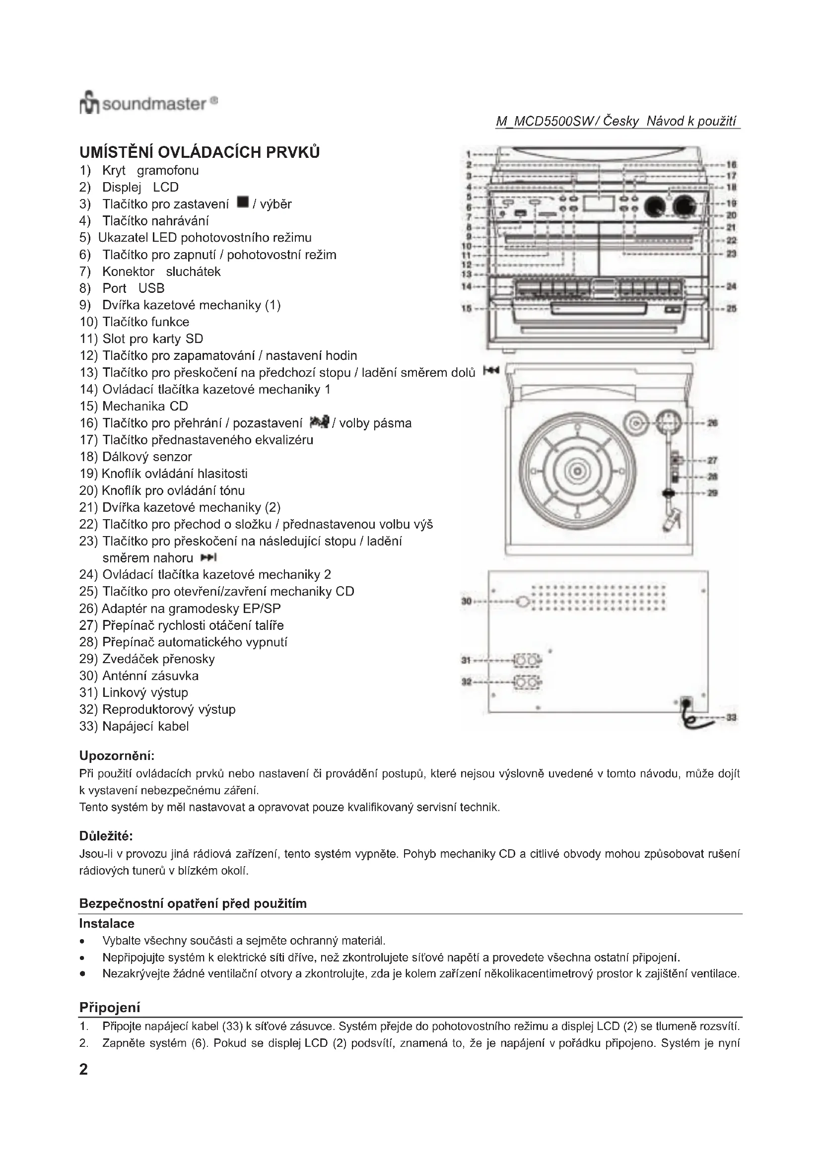 UpozornČQí: 3Ĝi pouåití ovládacích prvkĤ nebo nastavení þi provádČní postXSĤ, které nejsou výslovnČ uvedené v tomto návodu, mĤåe dojít k vystavení nebezpeþnému záĜení. Tento systém by mČl nastavovat a opravovat pouze kvalifikovaný servisní technik. DĤleåité: Jsou-li v provozu jiná rádiová zaĜízení, tento systém vypQČte. Pohyb mechaniky CD a citlivé obvody mohou zpĤsobovat rušení rádiových tunerĤ v blízkém okolí. Bezpeþnostní opatĜHQí pĜHG pouåitím Instalace x Vybalte všechny souþásti a sejmČte ochranný materiál. x NepĜipojujte systém k elektrické síti dĜíve, neå zkontrolujete síĢové naSČtí a provedete všechna ostatní pĜipojení. x Nezakrývejte åádné ventilaþní otvory a zkontrolujte, zda je kolem zaĜízení QČkolikacentimetrový prostor k zajištČQí ventilace. PĜipojení 1. 3Ĝipojte napájecí kabel (33) k síĢové zásuvce. Systém pĜejde do pohotovostního reåimu a displej LCD (2) se tlumeQČ rozsvítí. 2. ZDSQČte systém (6). Pokud se displej LCD (2) podsvítí, znamená to, åe je napájení v poĜádku pĜipojeno. Systém je nyníM_MCD5500SW