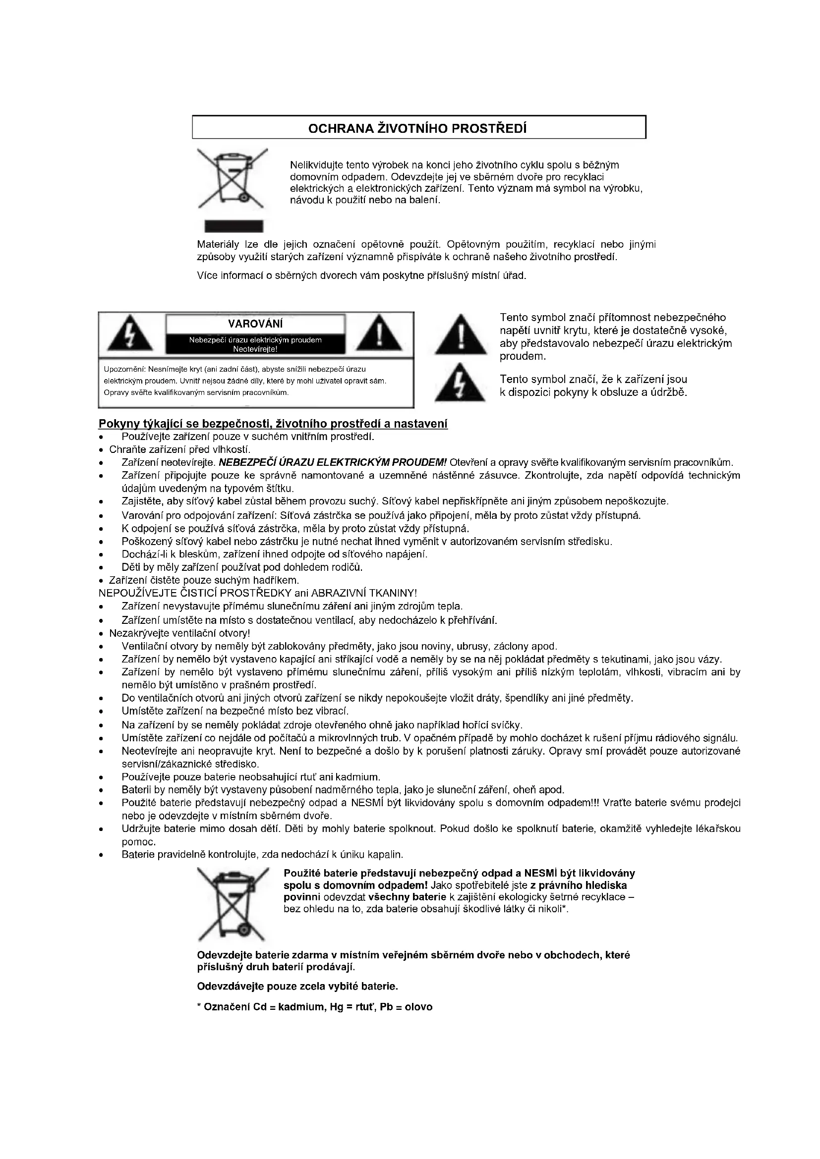 Neotevirejte ani neopravujte kryt. Nen to bezpecné a doslo by k poruseni platnosti zaruky. Opravy sm provadet pouze autorizované servisni/zakaznicke stredisko. - Používejte pouze baterie neobsahujíc rtut' ani kadmium.