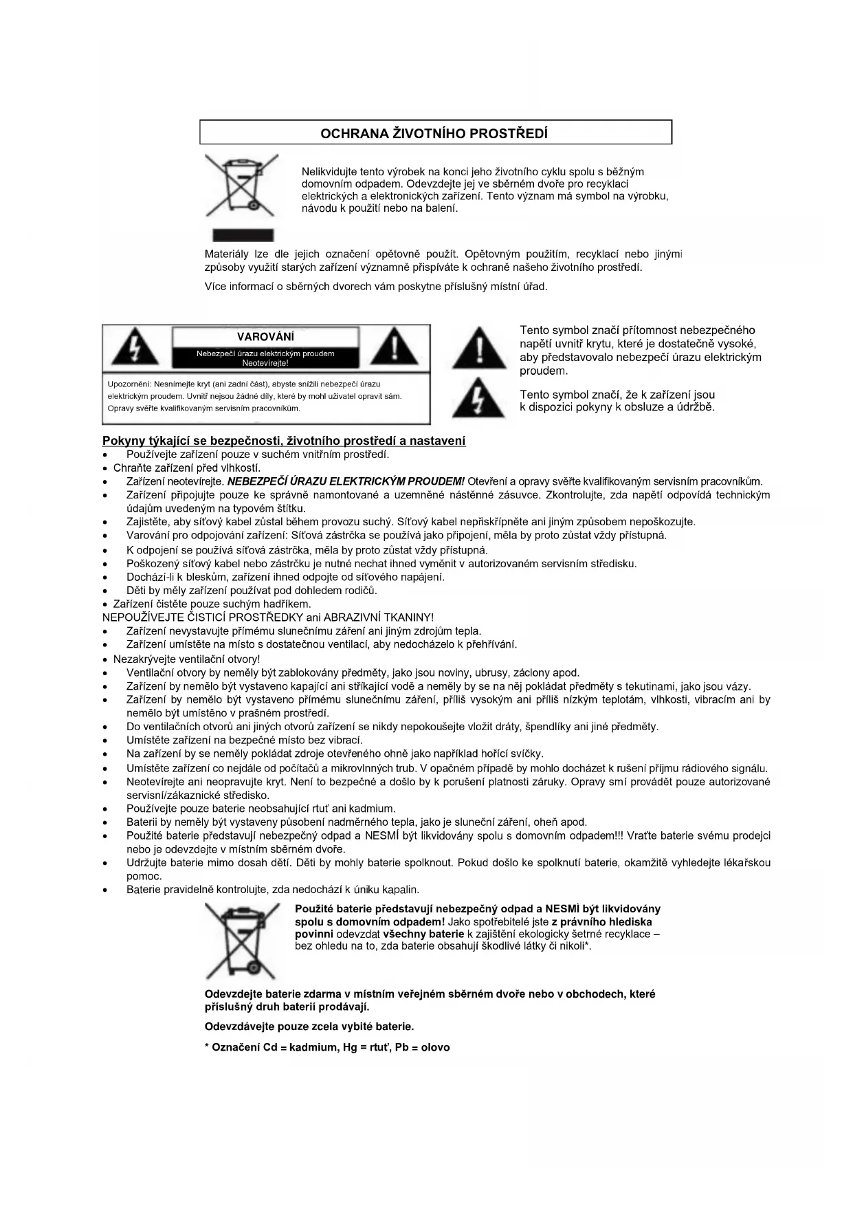 Tento symbol značí, že k zaízení jsou k dispozici pokyny k obsluze a údržbě. Pokyny týkající se bezpečnosti, životního prostedí a nastavení Používejte zaízení pouze v suchém vnitním prostedí. Chraňte zaízení ped vlhkostí. Zaízení neotevírejte. NEBEZPEČÍ ÚRAZU ELEKTRICKÝM PROUDEM! Otevení a opravy světe kvalifikovaným servisním pracovníkům. Zaízení pipojujte pouze ke správně namontované a uzemněné nástěnné zásuvce. Zkontrolujte, zda napětí odpovídá technickým údajům uvedeným na typovém štítku. Zajistěte, aby síťový kabel zůstal během provozu suchý. Síťový kabel nepiskípněte ani jiným způsobem nepoškozujte. Varování pro odpojování zaízení: Síťová zástrčka se používá jako pipojení, měla by proto zůstat vždy pístupná. K odpojení se používá síťová zástrčka, měla by proto zůstat vždy pístupná. Poškozený síťový kabel nebo zástrčku je nutné nechat ihned vyměnit v autorizovaném servisním stedisku. Dochází-li k bleskům, zaízení ihned odpojte od síťového napájení. Děti by měly zaízení používat pod dohledem rodičů. Zaízení čistěte pouze suchým hadíkem. NEPOUŽÍVEJTE ČISTICÍ PROSTEDKY ani ABRAZIVNÍ TKANINY! Zaízení nevystavujte pímému slunečnímu záení ani jiným zdrojům tepla. Zaízení umístěte na místo s dostatečnou ventilací, aby nedocházelo k pehívání. Nezakrývejte ventilační otvory! Ventilační otvory by neměly být zablokovány pedměty, jako jsou noviny, ubrusy, záclony apod. Zaízení by nemělo být vystaveno kapající ani stíkající vodě a neměly by se na něj pokládat pedměty s tekutinami, jako jsou vázy. Zaízení by nemělo být vystaveno pímému slunečnímu záení, píliš vysokým ani píliš nízkým teplotám, vlhkosti, vibracím ani by nemělo být umístěno v prašném prostedí. Do ventilačních otvorů ani jiných otvorů zaízení se nikdy nepokoušejte vložit dráty, špendlíky ani jiné pedměty. Umístěte zaízení na bezpečné místo bez vibrací. Na zaízení by se neměly pokládat zdroje oteveného ohně jako napíklad hoící svíčky. Umístěte zaízení co nejdále od počítačů a mikrovlnných trub. V opačném pípadě by mohlo docházet k rušení píjmu rádiového signálu. Neotevírejte ani neopravujte kryt. Není to bezpečné a došlo by k porušení platnosti záruky. Opravy smí provádět pouze autorizované servisní/zákaznické stedisko. Používejte pouze baterie neobsahující rtuť ani kadmium. Baterii by neměly být vystaveny působení nadměrného tepla, jako je sluneční záení, oheň apod. Použité baterie pedstavují nebezpečný odpad a NESMÍ být likvidovány spolu s domovním odpadem!!! Vraťte baterie svému prodejci nebo je odevzdejte v místním sběrném dvoe. Udržujte baterie mimo dosah dětí. Děti by mohly baterie spolknout. Pokud došlo ke spolknutí baterie, okamžitě vyhledejte lékaskou pomoc. Baterie pravidelně kontrolujte, zda nedochází k úniku kapalin.
