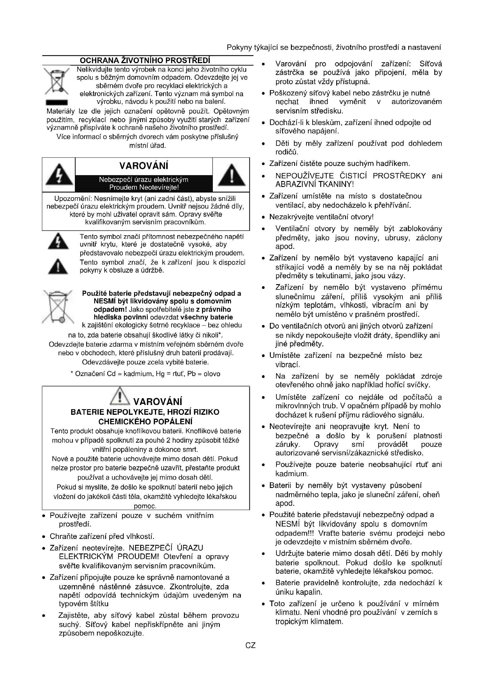 Používejte zaízení pouze v suchém vnitním prostedí. Chraňte zaízení ped vlhkostí. Zaízení neotevírejte. NEBEZPEČÍ ÚRAZU ELEKTRICKÝM PROUDEM! Otevení a opravy světe kvalifikovaným servisním pracovníkům. Zaízení pipojujte pouze ke správně namontované a uzemněné nástěnné zásuvce. Zkontrolujte, zda napětí odpovídá technickým údajům uvedeným na typovém štítku Zajistěte, aby síťový kabel zůstal během provozu suchý. Síťový kabel nepiskípněte ani jiným způsobem nepoškozujte. Varování pro odpojování zaízení: Síťová zástrčka se používá jako pipojení, měla by proto zůstat vždy pístupná. Poškozený síťový kabel nebo zástrčku je nutné nechat ihned vyměnit v autorizovaném servisním stedisku. Dochází-li k bleskům, zaízení ihned odpojte od síťového napájení. Děti by měly zaízení používat pod dohledem rodičů. Zaízení čistěte pouze suchým hadíkem. NEPOUŽÍVEJTE ČISTICÍ PROSTEDKY ani ABRAZIVNÍ TKANINY! Zaízení umístěte na místo s dostatečnou ventilací, aby nedocházelo k pehívání. Nezakrývejte ventilační otvory! Ventilační otvory by neměly být zablokovány pedměty, jako jsou noviny, ubrusy, záclony apod. Zaízení by nemělo být vystaveno kapající ani stíkající vodě a neměly by se na něj pokládat pedměty s tekutinami, jako jsou vázy. Zaízení by nemělo být vystaveno pímému slunečnímu záení, píliš vysokým ani píliš nízkým teplotám, vlhkosti, vibracím ani by nemělo být umístěno v prašném prostedí. Do ventilačních otvorů ani jiných otvorů zaízení se nikdy nepokoušejte vložit dráty, špendlíky ani jiné pedměty. Umístěte zaízení na bezpečné místo bez vibrací. Na zaízení by se neměly pokládat zdroje oteveného ohně jako napíklad hoící svíčky. Umístěte zaízení co nejdále od počítačů a mikrovlnných trub. V opačném pípadě by mohlo docházet k rušení píjmu rádiového signálu. Neotevírejte ani neopravujte kryt. Není to bezpečné a došlo by k porušení platnosti záruky. Opravy smí provádět pouze autorizované servisní/zákaznické stedisko. Používejte pouze baterie neobsahující rtuť ani kadmium. Baterii by neměly být vystaveny působení nadměrného tepla, jako je sluneční záení, oheň apod. Použité baterie pedstavují nebezpečný odpad a NESMÍ být likvidovány spolu s domovním odpadem!!! Vraťte baterie svému prodejci nebo je odevzdejte v místním sběrném dvoe. Udržujte baterie mimo dosah dětí. Děti by mohly baterie spolknout. Pokud došlo ke spolknutí baterie, okamžitě vyhledejte lékaskou pomoc. Baterie pravidelně kontrolujte, zda nedochází k úniku kapalin. Toto zaízení je určeno k používání v mírném klimatu. Není vhodné pro používání v zemích s tropickým klimatem.UR106 / Čeština Návod k použití