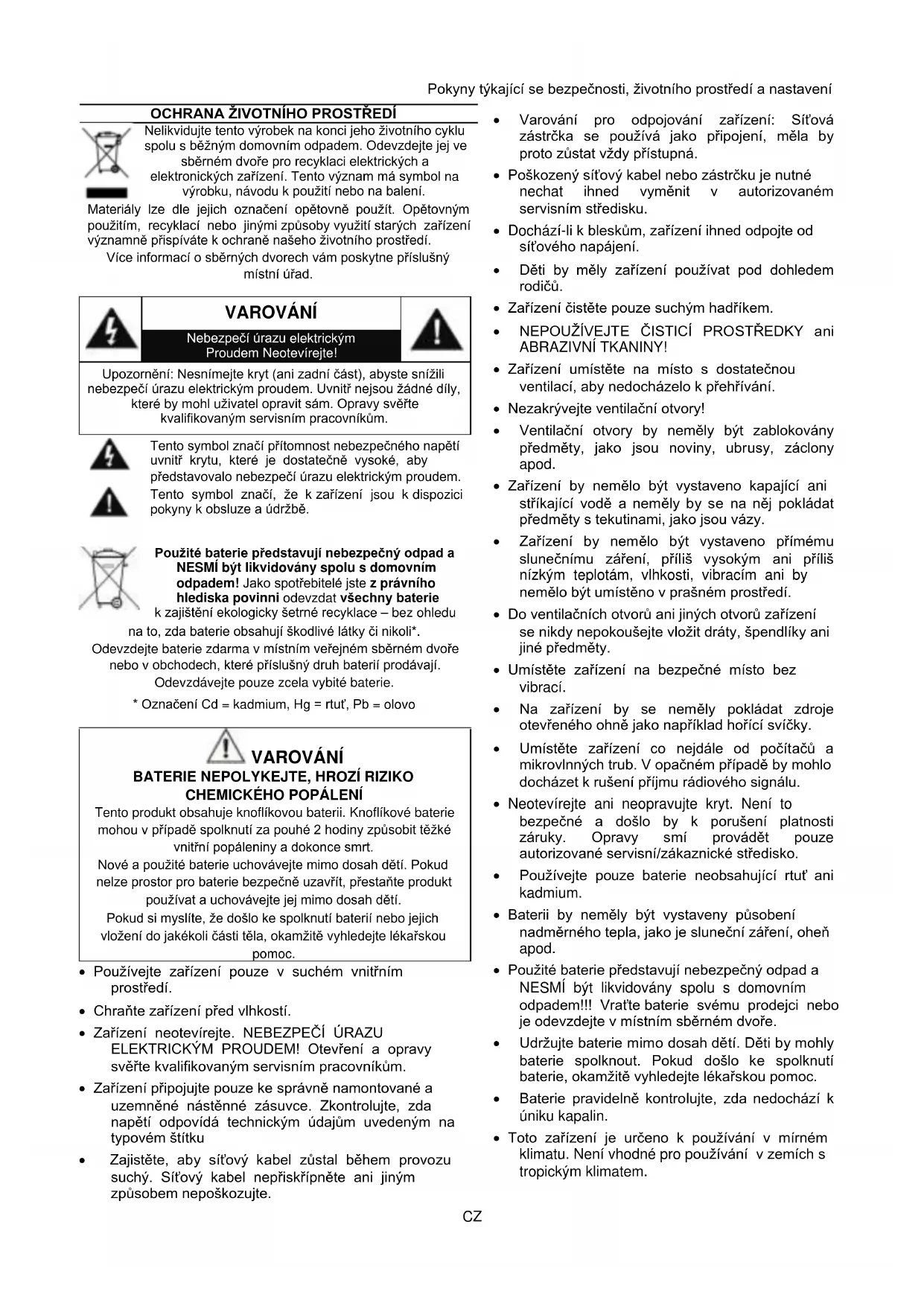 Baterie pravidelné kontrolujte, zda nedochází k uniku kapalin. - Toto zarifenji urceno k pouzivani v mirnem klimatu. Neni vchodne pro pouzivani v zemich s tropickym klimatem.