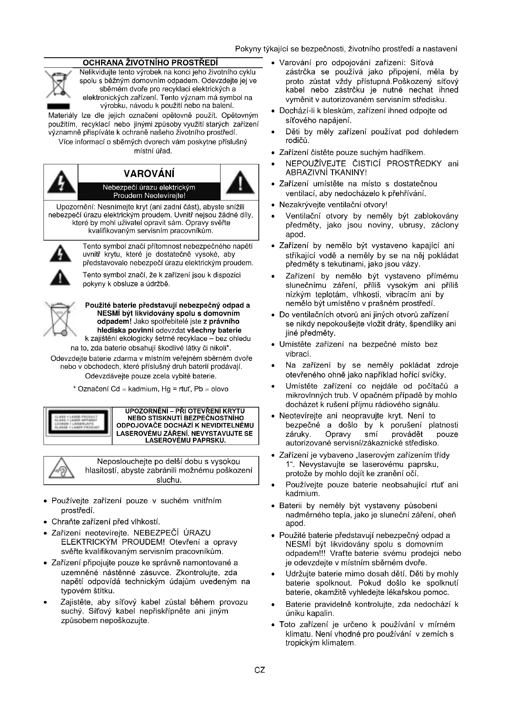 Varování pro odpojování zaízení: Síťová zástrčka se používá jako pipojení, měla by proto zůstat vždy pístupná.Poškozený síťový kabel nebo zástrčku je nutné nechat ihned vyměnit v autorizovaném servisním stedisku. Dochází-li k bleskům, zaízení ihned odpojte od síťového napájení. Děti by měly zaízení používat pod dohledem rodičů. Zaízení čistěte pouze suchým hadíkem. NEPOUŽÍVEJTE ČISTICÍ PROSTEDKY ani ABRAZIVNÍ TKANINY! Zaízení umístěte na místo s dostatečnou ventilací, aby nedocházelo k pehívání. Nezakrývejte ventilační otvory! Ventilační otvory by neměly být zablokovány pedměty, jako jsou noviny, ubrusy, záclony apod. Zaízení by nemělo být vystaveno kapající ani stíkající vodě a neměly by se na něj pokládat pedměty s tekutinami, jako jsou vázy. Zaízení by nemělo být vystaveno pímému slunečnímu záení, píliš vysokým ani píliš nízkým teplotám, vlhkosti, vibracím ani by nemělo být umístěno v prašném prostedí. Do ventilačních otvorů ani jiných otvorů zaízení se nikdy nepokoušejte vložit dráty, špendlíky ani jiné pedměty. Umístěte zaízení na bezpečné místo bez vibrací. Na zaízení by se neměly pokládat zdroje oteveného ohně jako napíklad hoící svíčky. Umístěte zaízení co nejdále od počítačů a mikrovlnných trub. V opačném pípadě by mohlo docházet k rušení píjmu rádiového signálu. Neotevírejte ani neopravujte kryt. Není to bezpečné a došlo by k porušení platnosti záruky. Opravy smí provádět pouze autorizované servisní/zákaznické stedisko. Zaízení je vybaveno „laserovým zaízením tídy 1“. Nevystavujte se laserovému paprsku, protože by mohlo dojít ke zranění očí. Používejte pouze baterie neobsahující rtuť ani kadmium. Baterii by neměly být vystaveny působení nadměrného tepla, jako je sluneční záení, oheň apod. Použité baterie pedstavují nebezpečný odpad a NESMÍ být likvidovány spolu s domovním odpadem!!! Vraťte baterie svému prodejci nebo je odevzdejte v místním sběrném dvoe. Udržujte baterie mimo dosah dětí. Děti by mohly baterie spolknout. Pokud došlo ke spolknutí baterie, okamžitě vyhledejte lékaskou pomoc. Baterie pravidelně kontrolujte, zda nedochází k úniku kapalin. Toto zaízení je určeno k používání v mírném klimatu. Není vhodné pro používání v zemích s tropickým klimatem.SCD2120 / Čeština Návod k použití