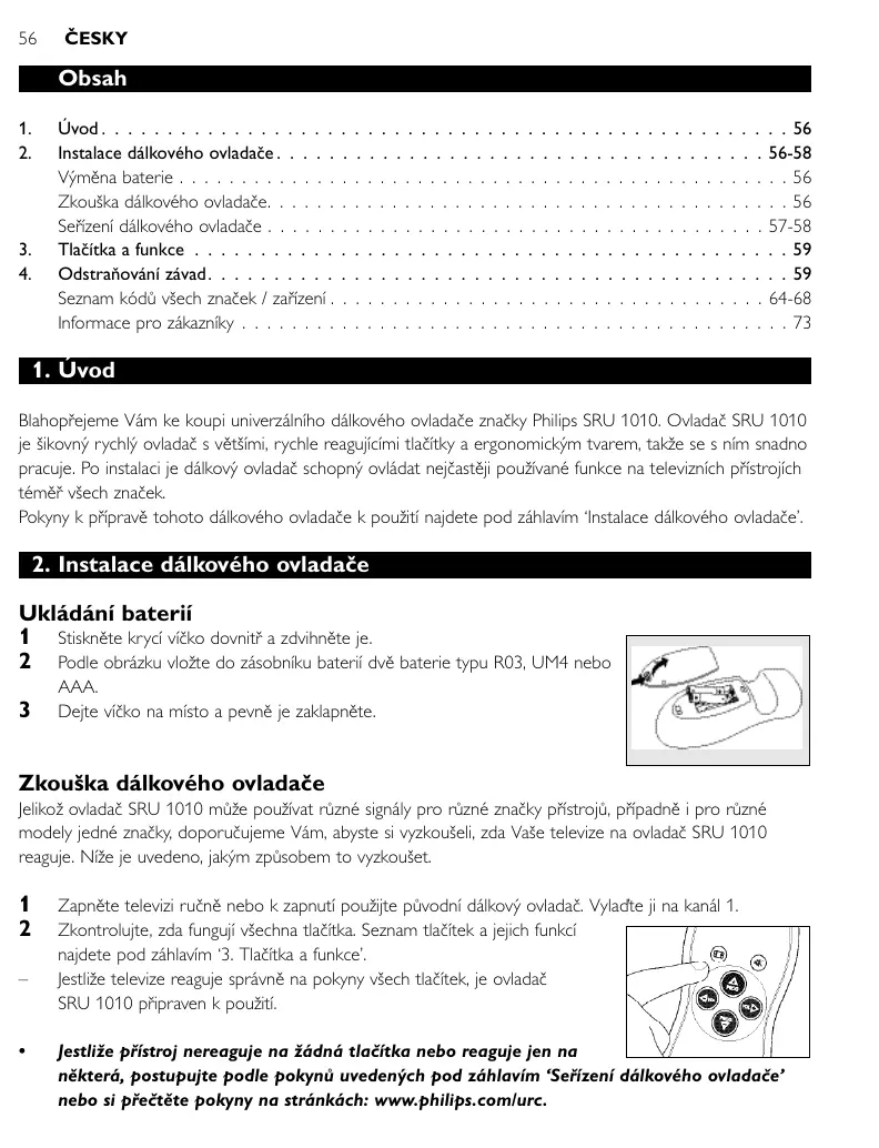 1. Úvod Blahopřejeme Vám ke koupi univerzálního dálkového ovladače značky Philips SRU 1010. Ovladač SRU 1010 je šikovný rychlý ovladač s většími, rychle reagujícími tlačítky a ergonomickým tvarem, takže se s ním snadno pracuje. Po instalaci je dálkový ovladač schopný ovládat nejčastěji používané funkce na televizních přístrojích téměř všech značek. Pokyny k přípravě tohoto dálkového ovladače k použití najdete pod záhlavím ‘Instalace dálkového ovladače’.