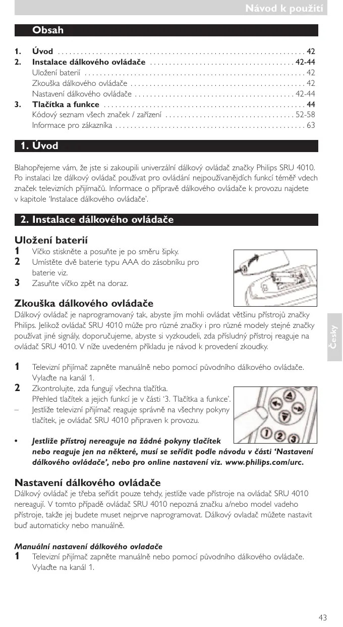 Úvod . . . . . . . . . . . . . . . . . . . . . . . . . . . . . . . . . . . . . . . . . . . . . . . . . . . . . . . . . . . . . . . . . 42 Instalace dálkového ovládače . . . . . . . . . . . . . . . . . . . . . . . . . . . . . . . . . . . . . . 42-44 Uložení baterií . . . . . . . . . . . . . . . . . . . . . . . . . . . . . . . . . . . . . . . . . . . . . . . . . . . . . . . . . . 42 Zkouška dálkového ovládače . . . . . . . . . . . . . . . . . . . . . . . . . . . . . . . . . . . . . . . . . . . . . . 42 Nastavení dálkového ovládače . . . . . . . . . . . . . . . . . . . . . . . . . . . . . . . . . . . . . . . . . . 42-44 Tlačítka a funkce . . . . . . . . . . . . . . . . . . . . . . . . . . . . . . . . . . . . . . . . . . . . . . . . . . . . . 44 Kódový seznam všech značek / zařízení . . . . . . . . . . . . . . . . . . . . . . . . . . . . . . . . . . 52-58 Informace pro zákazníka . . . . . . . . . . . . . . . . . . . . . . . . . . . . . . . . . . . . . . . . . . . . . . . . . . 63