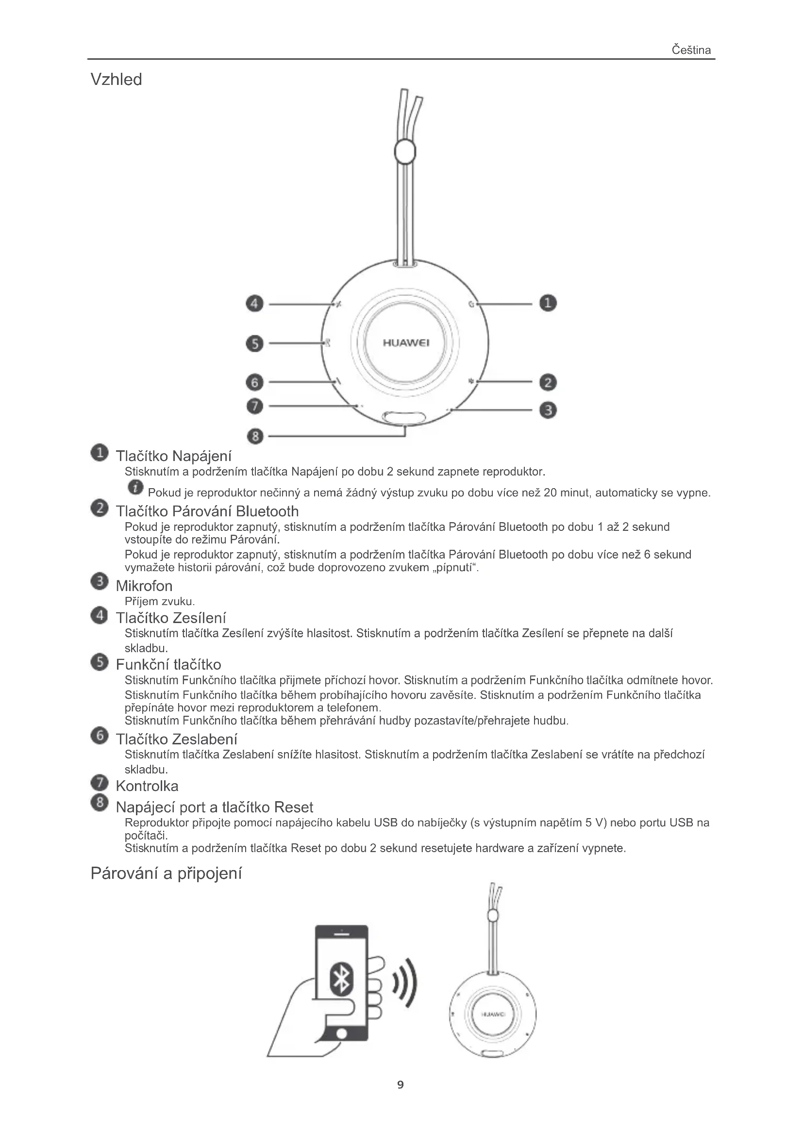 Reproduktor může najednou fungovat pouze s jedním zařízením Bluetooth. Chcete-li použít druhé zařízení, pozastavte přehrávání na prvním zařízení a přehrávání ručně spusťte na druhém zařízením, aby reproduktor začal fungovat s druhým zařízením. Chcete-li znovu spárovat reproduktor se dvěma zařízeními a na obou zařízeních existuje historie párování, můžete přímo znovu ustanovit připojení bez opětovného zahájení procesu párování. Bezpečnostní informace Než zařízení použijete, pečlivě si přečtěte následující bezpečnostní opatření, abyste zajistili optimální výkon produktu a předešli tak nebezpečí nebo porušení zákonů a předpisů. Elektronická zařízení Nepoužívejte toto zařízení v místech, kde je používání bezdrátových zařízení zakázáno. Mohlo by dojít k rušení jiných zařízení nebo způsobit jiná nebezpečí. Elektrické rušení lékařských zařízení Řiďte se pravidly a předpisy vydanými nemocnicemi a lékařskými zařízeními. Nepoužívejte zařízení na zakázaných místech. Některá bezdrátové zařízení mohou působit rušení implantabilních zdravotnických prostředků a další zdravotnické techniky, jako jsou například kardiostimulátory, kochleární implantáty a naslouchátka. Další informace získáte od výrobce lékařského vybavení. Udržujte minimální vzdálenost 15 cm mezi tímto zařízením a implantabilními zdravotnickými prostředky (jako např. kardiostimulátory nebo kochleárními implantáty), abyste zabránili potenciálnímu rušení. Bezpečnost na silnicích Při používání tohoto zařízení dodržujte všechny místní dopravní zákony a předpisy. Nepoužívejte zařízení při řízení. Věnujte se řízení. Vaší odpovědností je řídit bezpečně. Bezdrátové signály se mohou rušit s elektrickými systémy vozidla. Bližší podrobnosti si ověřte u výrobce vozidla. Zařízení neumisťujte přímo nad nebo okolo oblastí, kde se mohou nafouknout airbagy a způsobit vážná zranění. Bezdrátová zařízení mohou rušit systémy letadla. Bezdrátová zařízení vypněte podle předpisů leteckých společností. Provozní prostředí Vyhněte se prašnému, vlhkému nebo špinavému prostředí. Vyhněte se magnetickým polím. Používání zařízení v těchto prostředích může vést k funkční poruše obvodů. Používejte zařízení tam, kde je okolní teplota mezi 0 °C a +45 °C. Zařízení a příslušenství skladujte tam, kde je okolní teplota mezi -10 °C a +45 °C. Extrémní teplo nebo chlad může zařízení poškodit. Zařízení a jeho příslušenství neponořujte do vody či jiných kapalin, protože to může způsobit požár nebo úraz elektrickým proudem. Neponechávejte zařízení v blízkosti zdrojů ohně nebo tepla, jako jsou elektrické ohřívače, trouby, mikrovlnné trouby, sporáky nebo ohřívače vody. Zamezte kontaktu jehel nebo jiných ostrých kovových předmětů s reproduktorem nebo mikrofonem, protože to může způsobit poškození zařízení nebo se můžete zranit. Vyhněte se dlouhodobému dotýkání zařízení, pokud je jeho provozní teplota příliš vysoká, protože to může způsobit nízkoteplotní popáleniny nebo podráždění pokožky. Zařízení uchovávejte mimo dosah dětí a domácích zvířat, aby nedošlo k nechtěnému vdechnutí či spolknutí malých částí zařízení. Okusování a konzumace zařízení může mít závažné zdravotní následky. Bezpečnost dětí Toto zařízení a jeho příslušenství může obsahovat drobné součástky, které představují nebezpečí zadušení. Udržujte zařízení a jeho příslušenství mimo dosah dětí, aby se zabránilo zranění nebo náhodnému poškození. Toto zařízení není hračka. Děti smí používat zařízení pouze pod dohledem dospělé osoby. Příslušenství Používejte pouze autorizovaná příslušenství, která jsou určena pro zařízení. V opačném případě nemusí záruka pokrývat poškození zařízení. Používání neautorizovaných příslušenství může znamenat také bezpečnostní riziko. Více informací vám poskytne autorizované centrum zákaznických služeb společnosti Huawei. Používání neschváleného nebo nekompatibilního napájecího adaptéru, nabíječky nebo baterie může způsobit požár, explozi nebo jiná nebezpečí. Zabezpečení nabíječky Pokud potřebujete zařízení nabíjet pomocí portu USB, přesvědčte se, že má port certifikaci USB-IF a splňujeČeština