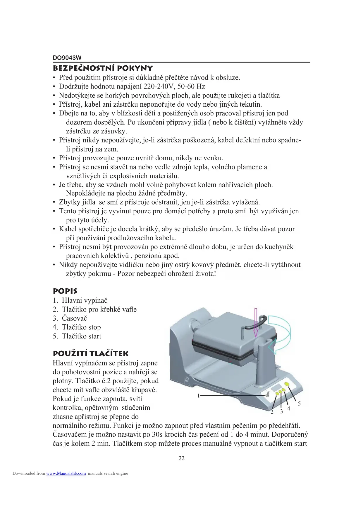 Downloaded from www.Manualslib.com manuals search engineDO9043W Čištění NIKDY NEPONOŘOVAT DO TEKUTINY, PŘED ČIŠTĚNÍM ODPOJIT OD ZDROJE PROUDU A NECHAT VYCHLADIT. Nepoužívejte žádné drátěnky nebo drsné prostředky. Čištění vnitřní strany: Výhřevné desky čistěte absorbující papírovou utěrkou nebo vlhkým hadrem. I když jsou výhřevné desky potaženy ochrannou vrstvou, mohou se na ně nalepit zbytky těsta. Snadno je odstraníte, když desky natřete olejem. Nechte olej 5 – 10 minut vsáknout a zbytky setřete kouskem papírové utěrky. Pokud olej nepomůže, můžete desky umýt pomocí navlhčeného hadru a malého množství jemného čistícího prostředku. Čištění vnější strany: Otřete suchým hadrem. Tento přístroj nesmí být obsluhován osobami s mentální nebo motorickou poruchou a také lidmi bez základních zkušeností pro obsluhu. Obsluhu je nutno řádně proškolit nebo nechat pracovat pod dozorem. Zvláště dětem není dovoleno si s přístrojem hrát nebo jej samostatně obsluhovat. Waovač nesmí být používán po extrémně dlouho dobu jako profesionální přístroje. Je určen zvláště do kuchyněk pracovních kolektivů, kanceláří, hotelových pokojů nebo podobných zařízení pro nárazové použití.
